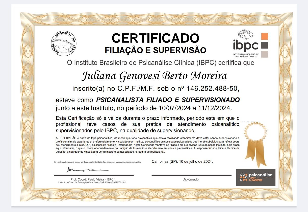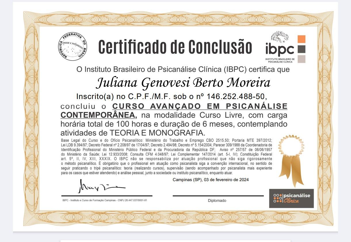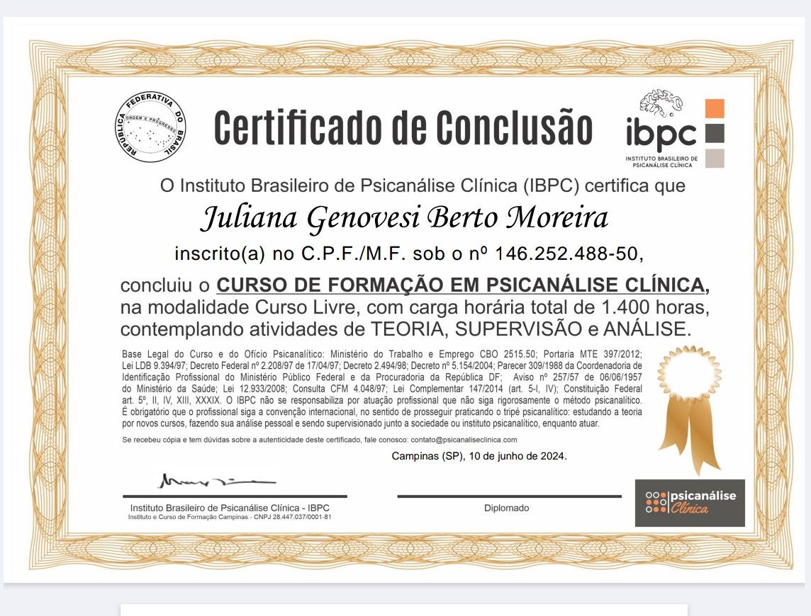 Complementando esta jornada, conto com 12 anos de experiência em análise pessoal, essencial para a minha formação constante e para a prática clínica.