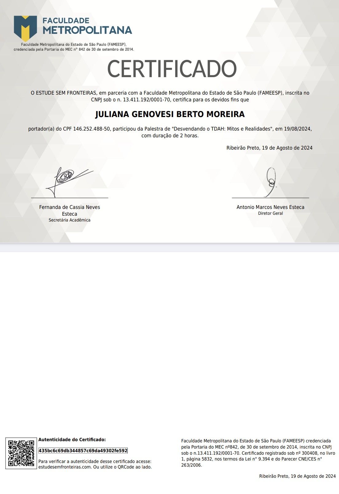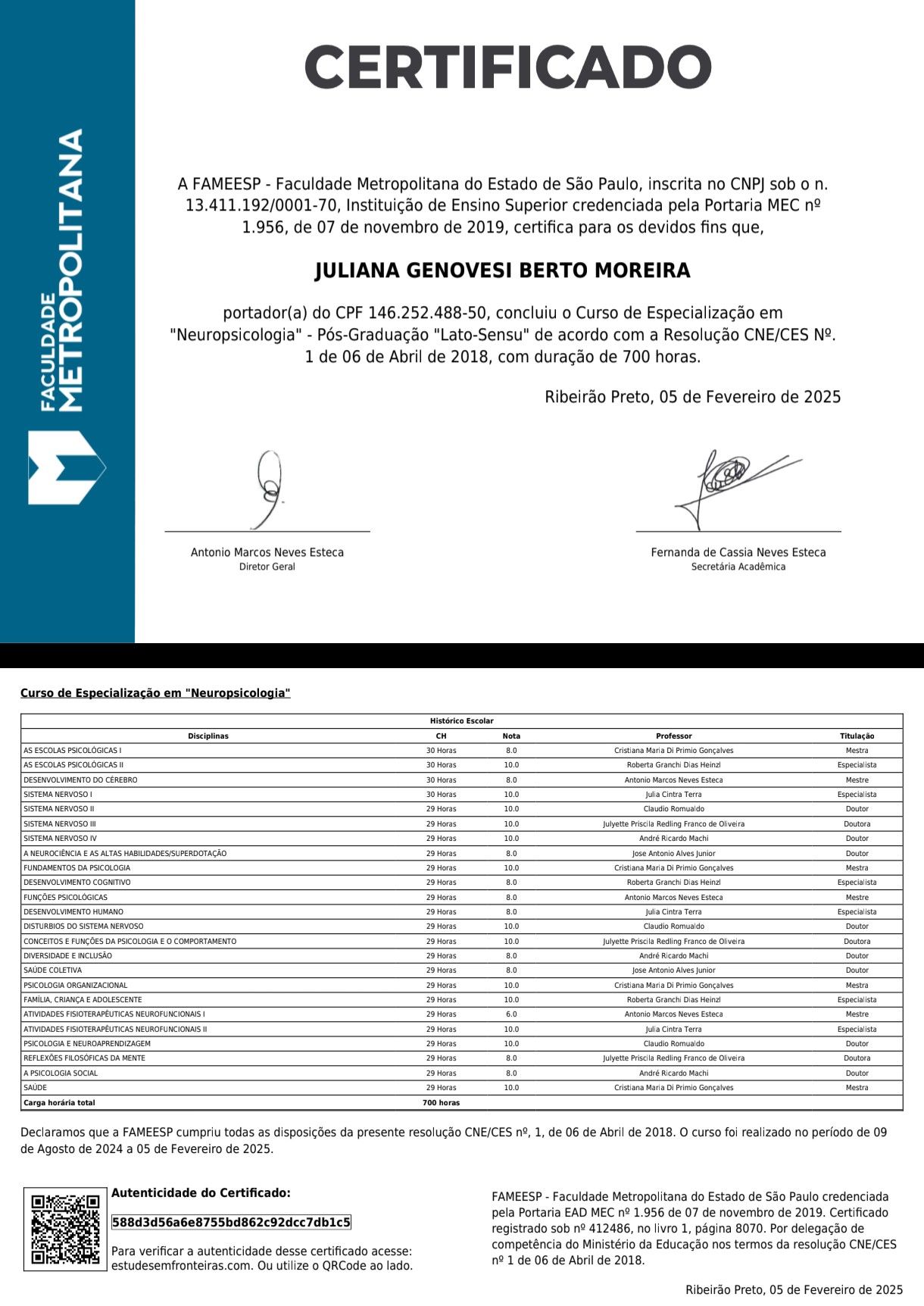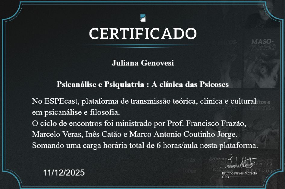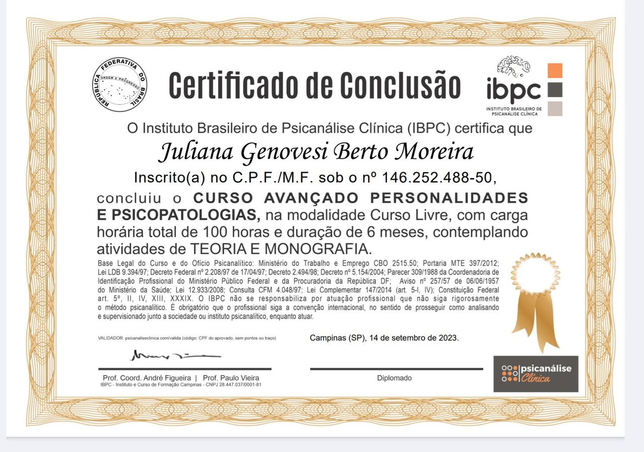 Sou especialista em Neuropsicologia pela Faculdade Metropolitana de Ribeirão Preto. Atualmente, dedico-me à pós-graduação em Psicopatologia, Psicanálise e Clínica Contemporânea pelo Instituto ESPE, um curso de dois anos com foco principal na produção de artigos científicos, estudos de caso e prática clínica.