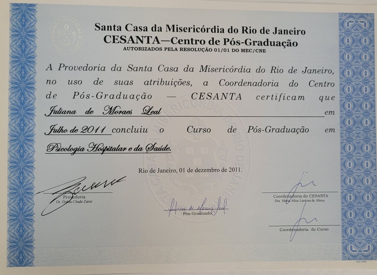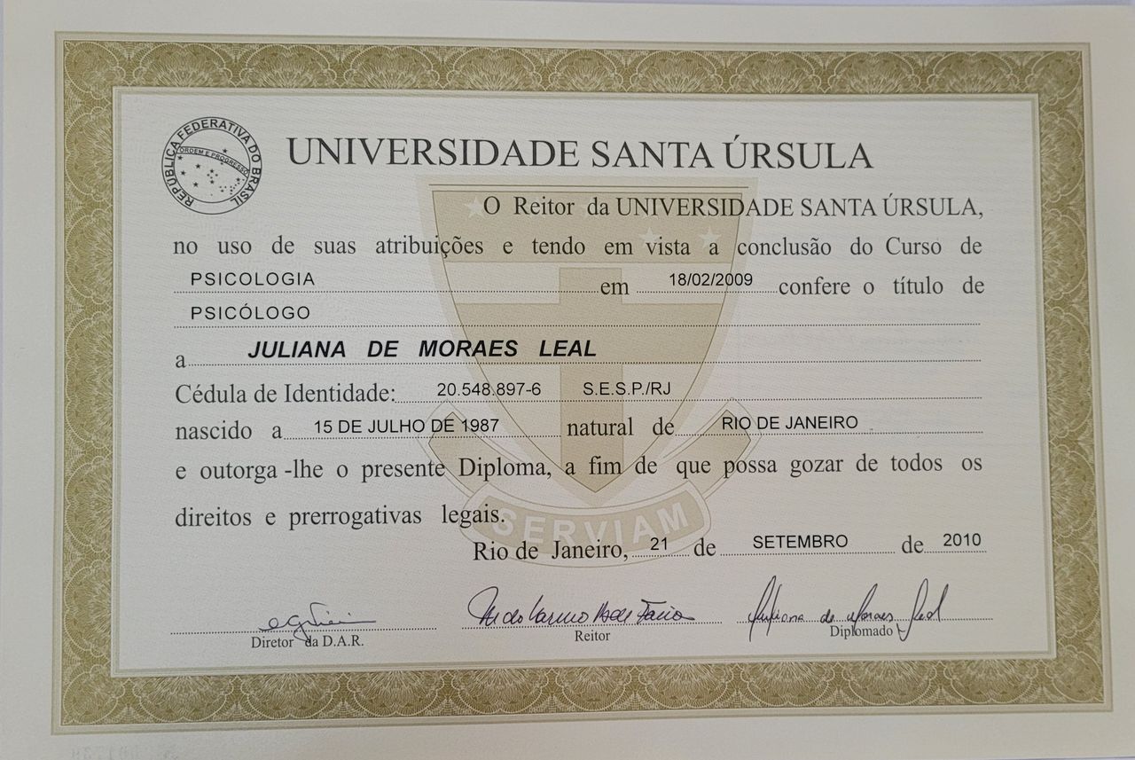 Sou graduada em Psicologia pela Universidade Santa Úrsula (RJ), desde 2008, e tenho especialização em Psicologia Hospitalar e da Saúde, concluída em 2011 na Santa Casa de Misericórdia do Rio de Janeiro.