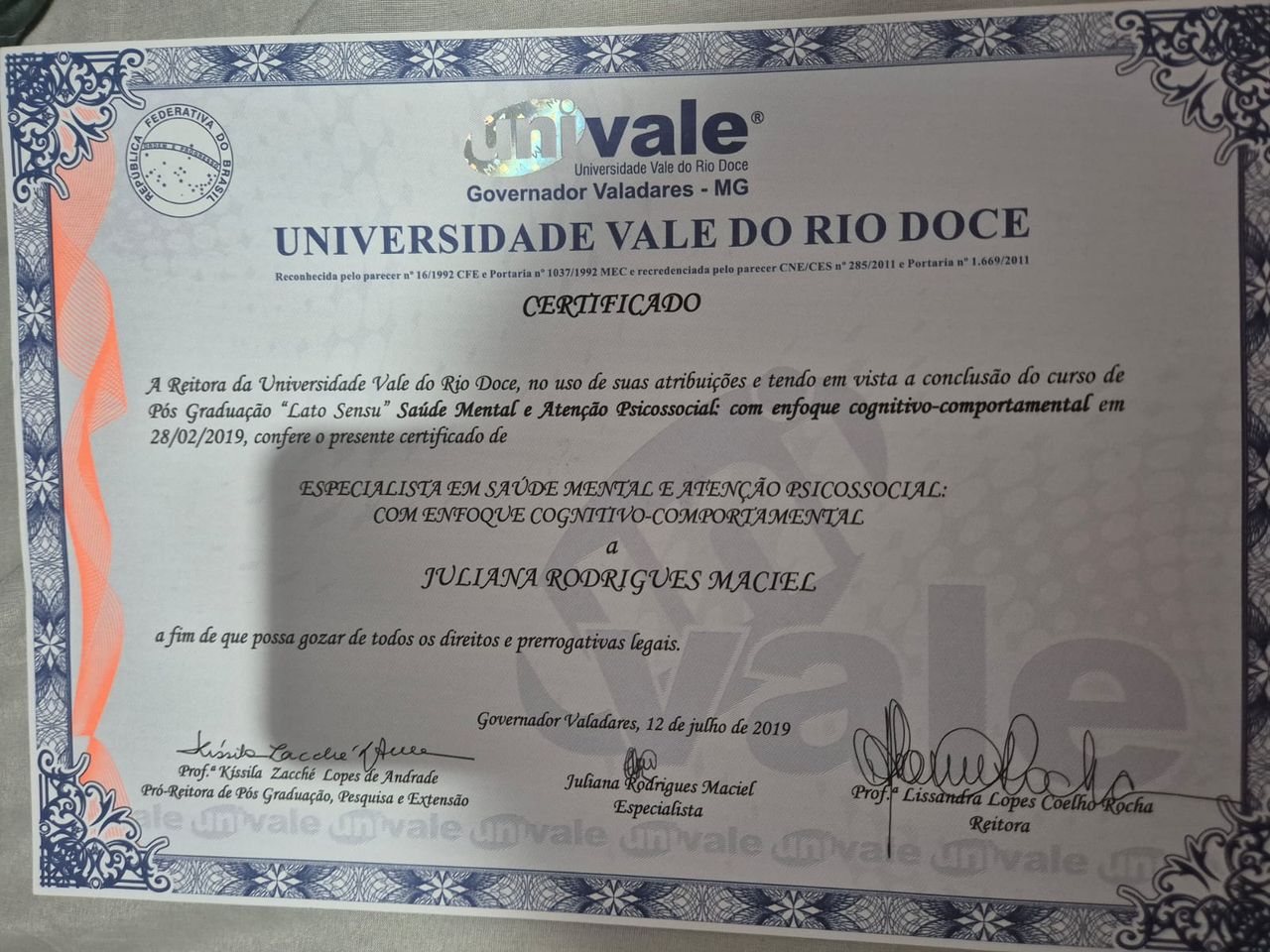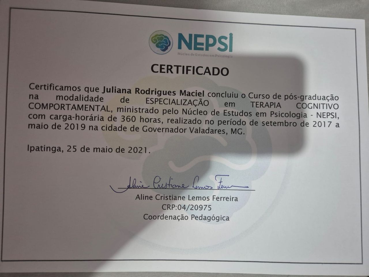 Possuo especialização em Terapia Cognitivo-Comportamental e Saúde Mental e Atenção Psicossocial: com enfoque Cognitivo-Comportamental.