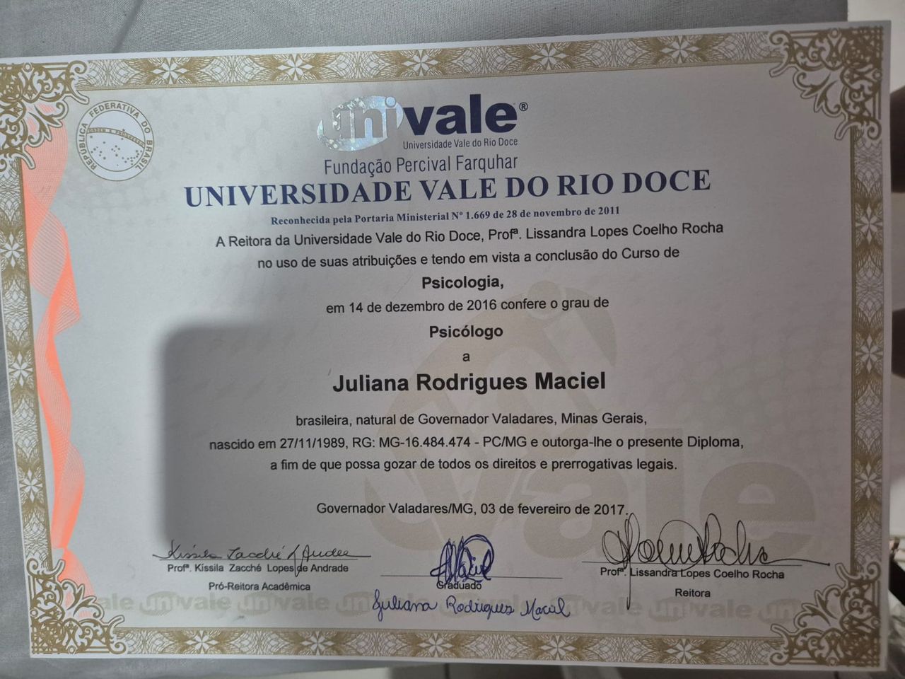 Meu nome é Juliana Rodrigues Maciel Rocha, sou Esposa, Mãe, Cristã, Cantora e Compositora nas horas livres, Escritora, Psicóloga (CRP 04/46934 e CRP 04/PJ 3379) em Governador Valadares/MG (local onde nasci e resido) e On-line, Hipnoterapeuta, Coach, Mentora de Terapeutas e Coaches, Palestrante e Facilitadora de grupos.