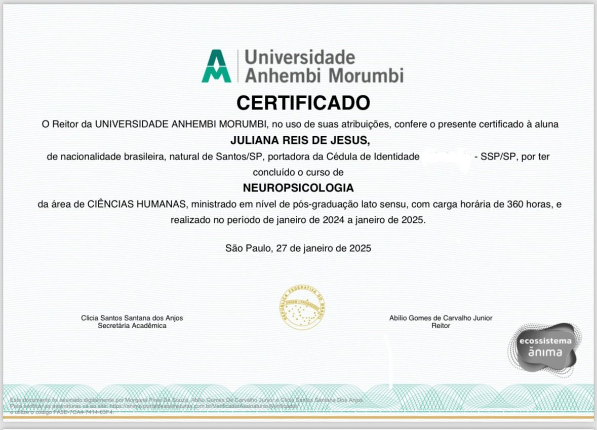 Sou pós-graduada em Neuropsicologia pela Universidade Anhembi Morumbi (2025), o que me permite uma compreensão mais ampla das funções cognitivas e emocionais, integrando esse conhecimento ao trabalho clínico de forma humanizada.