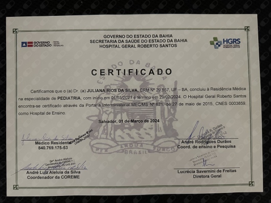 Médica Pediatra com residência médica pelo Hospital Geral Roberto Santos