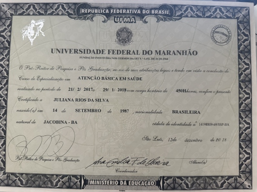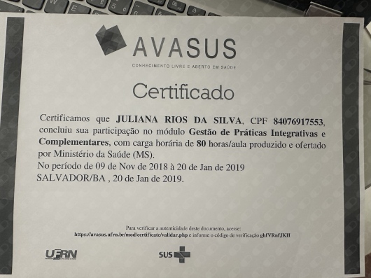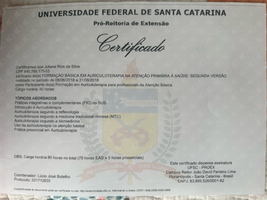 Formação em Práticas Integrativas Complementares (Homeopatia pela Escola Bahiana de Medicina e Saúde Pública, Auriculoterapia pela Universidade Federal de Santa Catarina