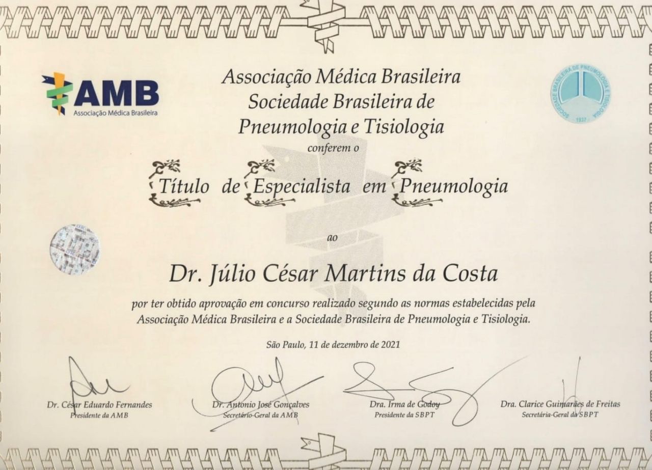 Especializei em Pneumologia pela Santa Casa de Misericórdia de Belo Horizonte e tenho título de especialista em Pneumologia pela Sociedade Brasileira de Pneumologia e Associação Médica Brasileira.