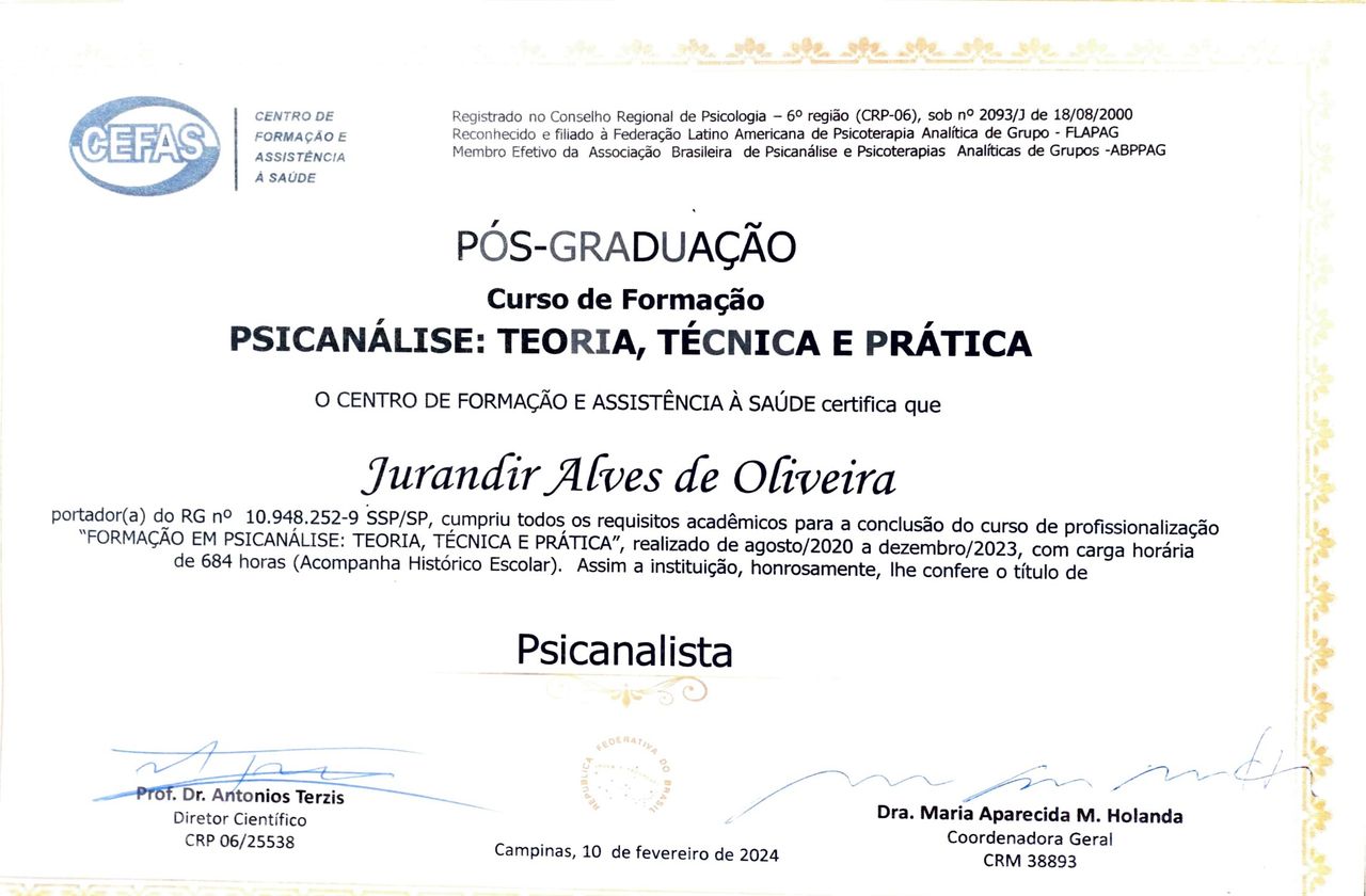 Em primeiro lugar quero agradecer a ajuda em um momento muito delicado da minha vida, i momento o qual eu superei com o trabalho do psicanalista Jurandir,. Me premiti a recomeçar e a descobrir a pessoa que eu sou hoje, vivo o melhor que posso agora e sonho com grandes desafios que me fazem viver plenamente. Obrigada dr. Jurandir por ressucitar a minha pessoa que só respirava no passado, hoje eu VIVO.