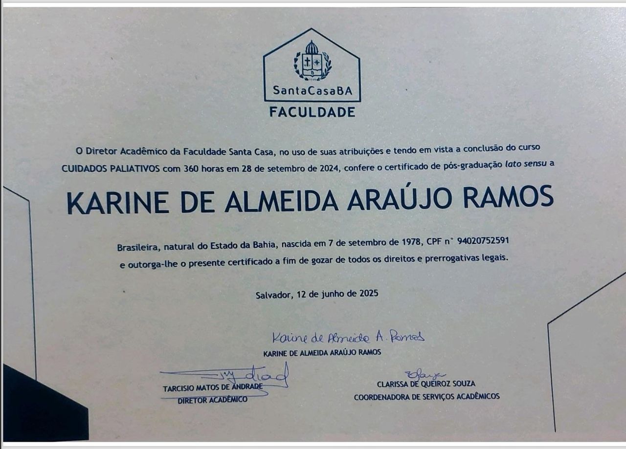 Em 2024 concluir pós graduação em Cuidados Paliativos pela Faculdade Santa Casa e desde então atuo em cuidados paliativos ambulatorial e hospitalar além de atendimento domiciliar.