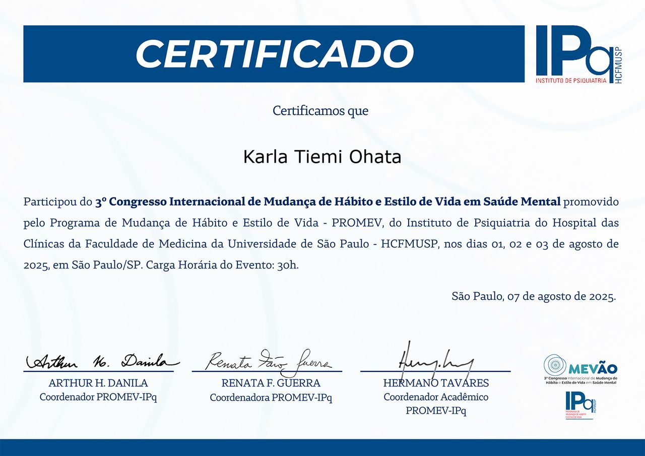 Quais são as principais especialidades de Karla Tiemi Ohata?Karla Tiemi Ohata é psiquiatra. Te mostramos alguns dos serviços oferecidos pelo especialista graças à sua trajetória e vasta experiência: Teleconsulta, Primeira consulta Psiquiatria, Retorno de consultas Psiquiatria, Consulta de seguimento (pacientes que não são primeira vez), Continuação de acompanhamento.