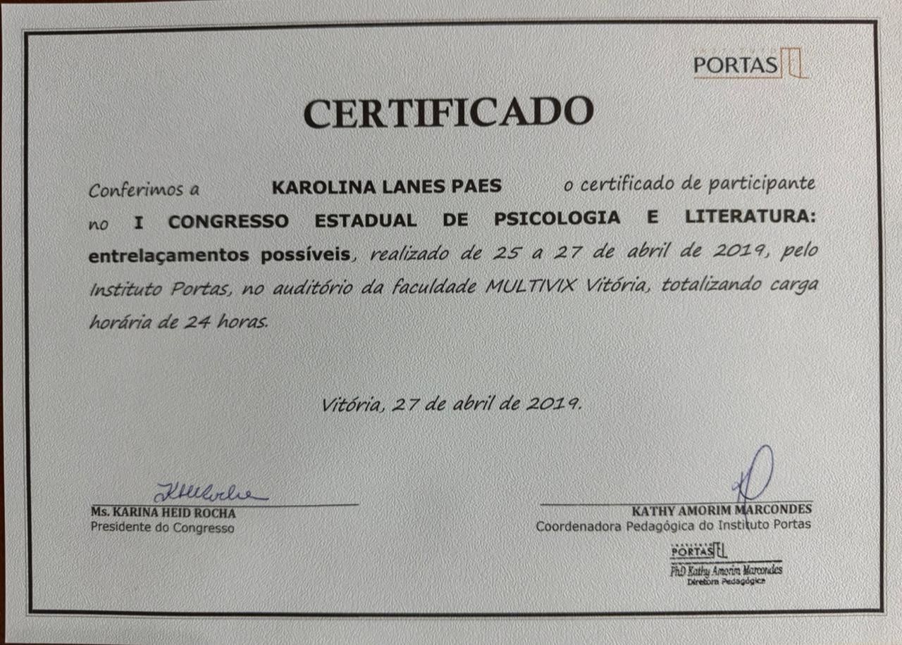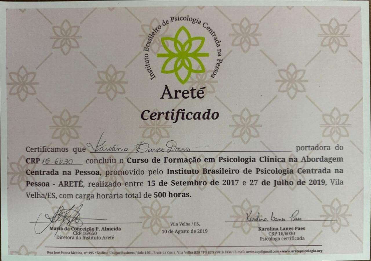 Meu trabalho é sustentado pelas formações e constante aprofundamento profissional, sou Formada em Psicologia (UVV), com especialização em Psicologia Humanista – Abordagem Centrada na Pessoa (Instituto ARETÉ), Mandala Terapêutica (Instituto CEIMAS) e estou com formação em andamento em Gestalt-terapia (Instituto Gestalt Paraná).