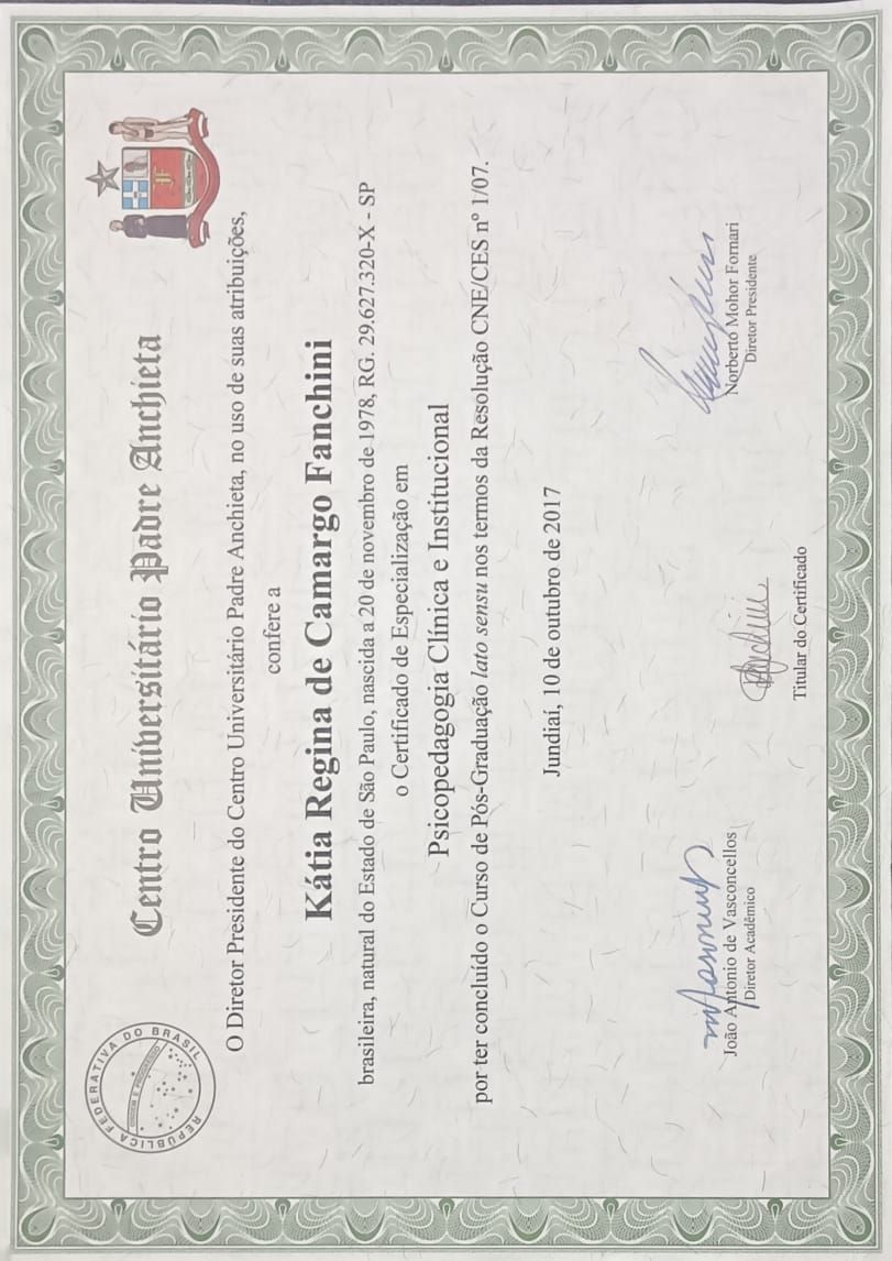 Quais são as principais especialidades de Kátia Regina de Camargo Fanchini?Kátia Regina de Camargo Fanchini é psicopedagoga. Te mostramos alguns dos serviços oferecidos pelo especialista graças à sua trajetória e vasta experiência: Primeira consulta Psicopedagogia, Primeira consulta psicologia, Tratamento da dislexia, Alfabetização, Estimulação cognitiva, Tratamento para transtorno de ansiedade, Reabilitação psicomotora, Estimulação psicomotora, Terapia Comportamental, Teleconsulta.