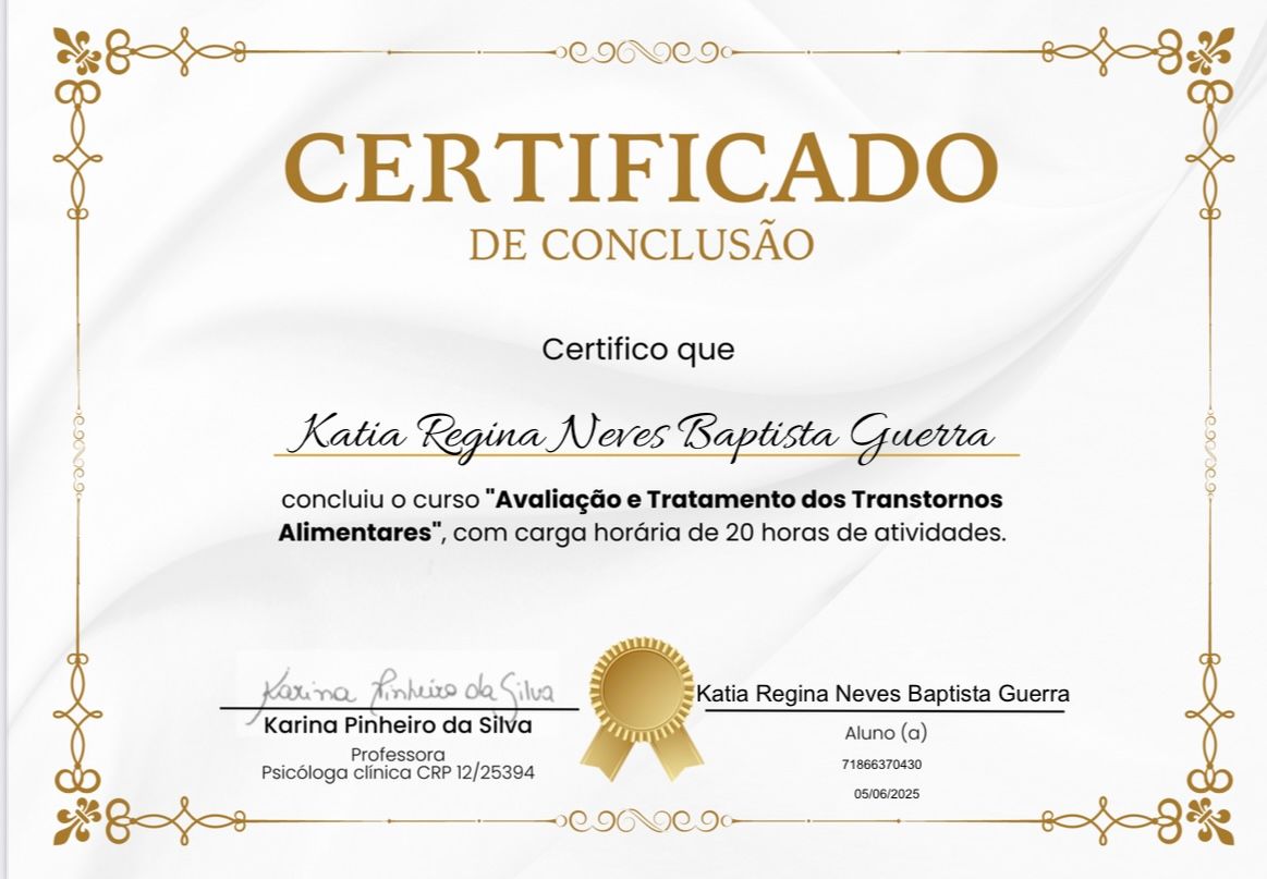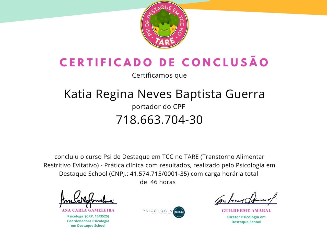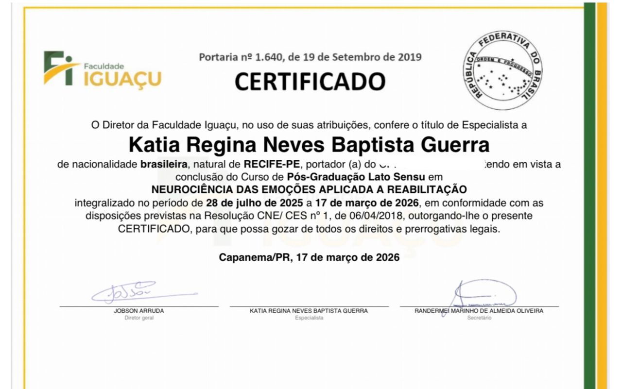 Olá, Sou Kátia Regina Neves Baptista Guerra, Psicóloga formada pela faculdade FAFIRE, CRP 02/22746; Atuo na Clínica psicológica, pela abordagem Cognitiva tanto pela Terapia do Esquema, como pela Terapia Cognitiva Comportamental. Sou Especialista em Terapia do Esquema- Faculdade Verbo Educacional-RS e Terapia Cognitivo Comportamental- Unibf-PR; Certificada em Terapia do Esquema- Portal Relacionando-se-SP; curso de Capacitação-Fundamentos da Terapia do Esquema pela Wainer Psicologia Cognitiva..