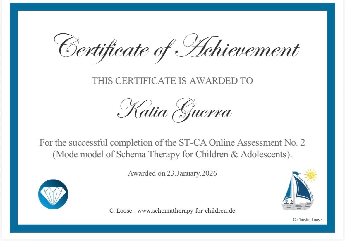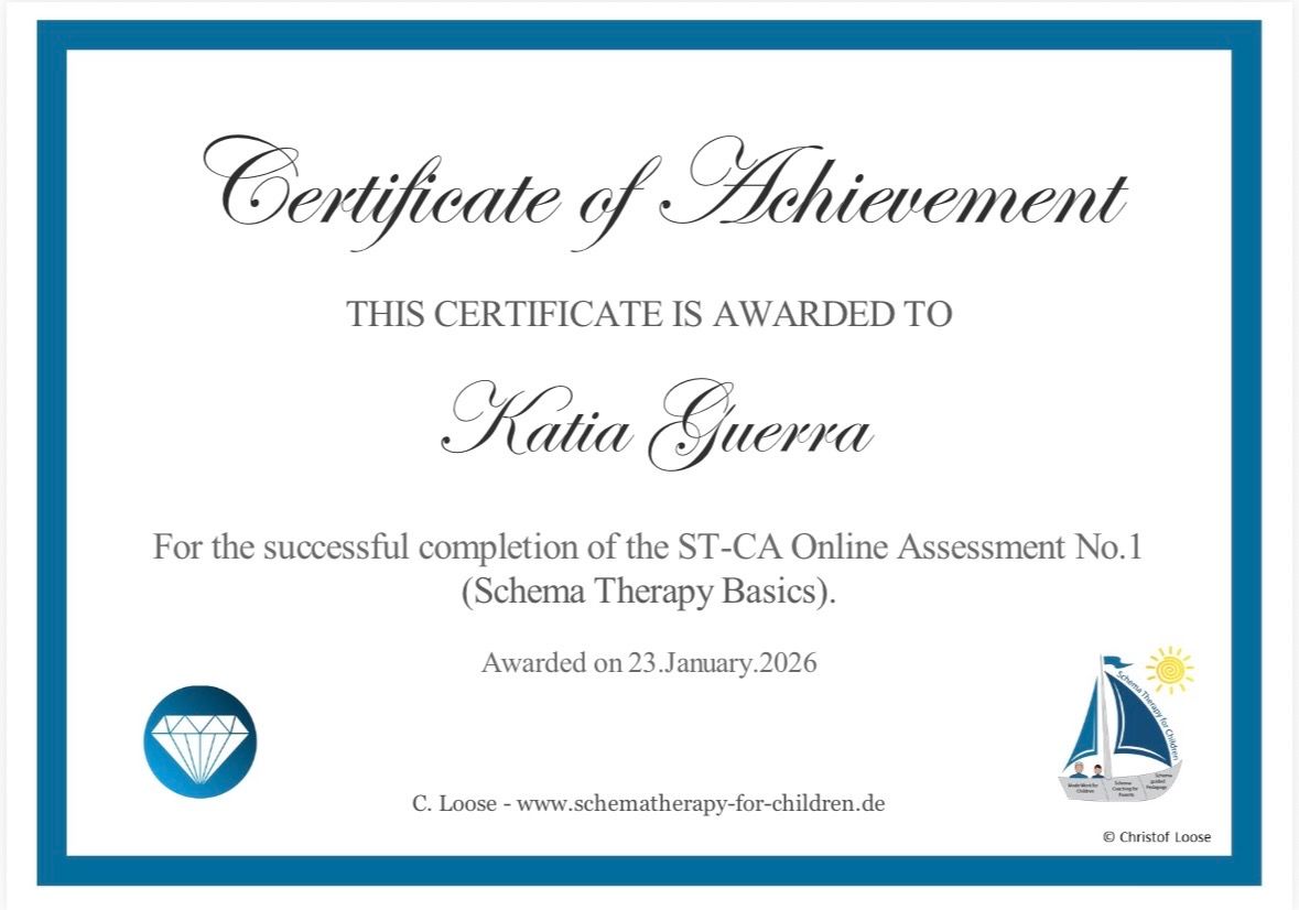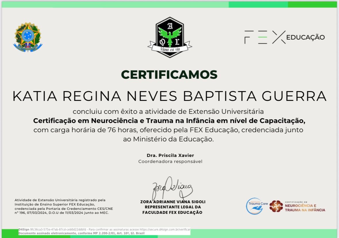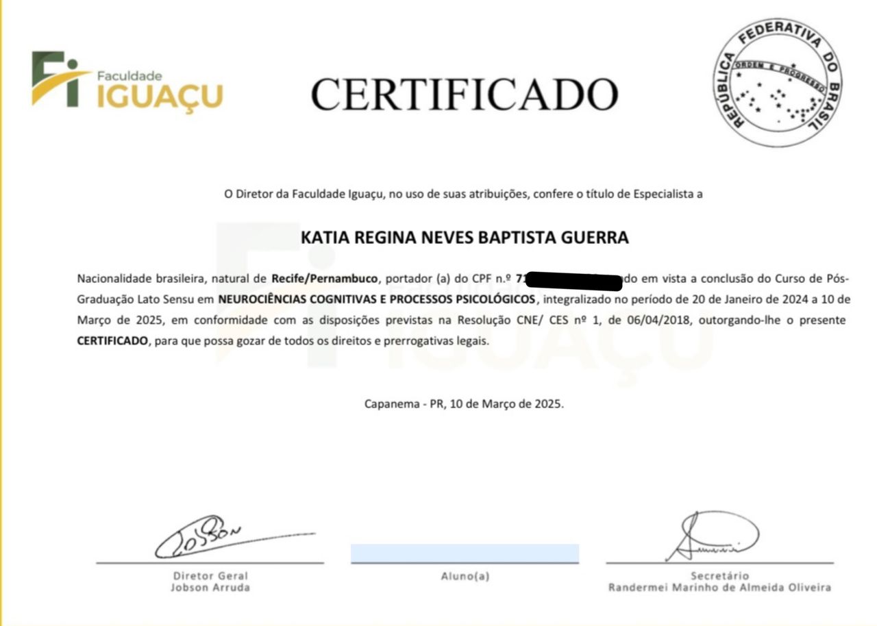 Olá, Sou Kátia Regina Neves Baptista Guerra, Psicóloga formada pela faculdade FAFIRE, CRP 02/22746; Atuo na Clínica psicológica, pela abordagem Cognitiva tanto pela Terapia do Esquema, como pela Terapia Cognitiva Comportamental. Sou Especialista em Terapia do Esquema- Faculdade Verbo Educacional-RS e Terapia Cognitivo Comportamental- Unibf-PR; Certificada em Terapia do Esquema- Portal Relacionando-se-SP; curso de Capacitação-Fundamentos da Terapia do Esquema pela Wainer Psicologia Cognitiva..