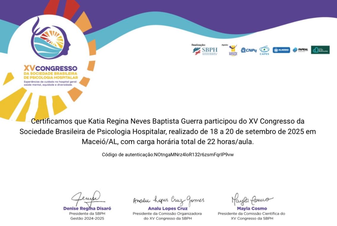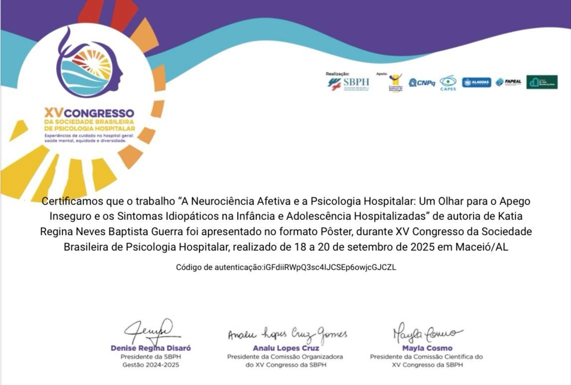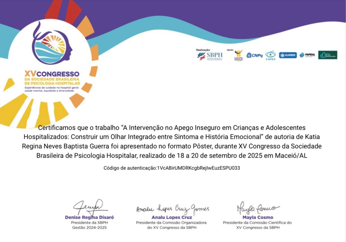 *Discente em projetos de Extensão Federal pela Proext/ UFPE( Hospital das Clínicas- UFPE), no período de 2015 à março de 2020); Psicóloga Hospitalar voluntária, no setor de Pediatria até julho 2023.