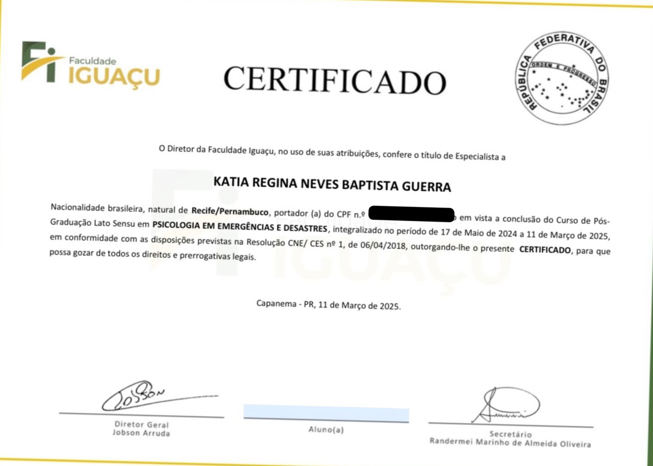 *Avaliação Psicológica e Psicodiagnóstico;*Neuropsicopedagogia;* Psicopedagogia Institucional, Clínica e Hospitalar; *Psicologia e Transtorno do Espectro Autista; MBA Executivo em Gestão da Psicologia Organizacional)Todas pela Faculdade UNIBF-PR); Pedagoga formada pela Universidade Federal de Pernambuco; Especialista em Administração Escolar e Planejamento Educacional(UFPE).