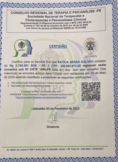 Quais são as principais especialidades de Katica Serak Galvão?Katica Serak Galvão é psicóloga. Te mostramos alguns dos serviços oferecidos pelo especialista graças à sua trajetória e vasta experiência: Teleconsulta, Primeira consulta psicologia, Consulta Psicologia, Retorno de consulta psicologia, Retorno de consultas Psicanálise, Psicoterapia, Tratamento da ansiedade, Consulta psicológica do adulto, Psicoterapia adulto, Psicoterapia Psicanalítica.
