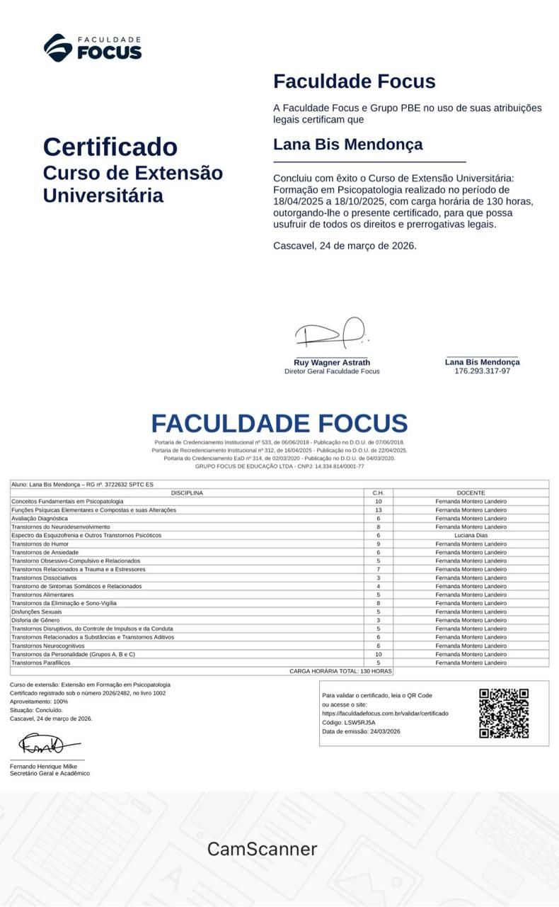 Me chamo Lana e conduzo meus atendimentos com base na Terapia Cognitivo-Comportamental (TCC), uma abordagem focada em identificar e modificar pensamentos e comportamentos que causam sofrimento emocional, reconhecida por sua base científica consistente, priorizando intervenções práticas, estruturadas e eficazes. Me especializei em Psicopatologia, o que amplia minha compreensão sobre os diferentes transtornos mentais e contribui para um cuidado ainda mais qualificado e individualizado. Ao longo da graduação, minha atuação em ambientes hospitalares e em atendimentos clínicos consolidou meu interesse com a área da saúde mental.