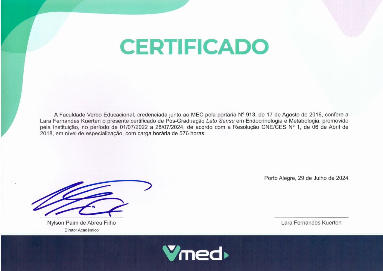 Quais são as principais especialidades de Lara Kuerten?Lara Kuerten é endocrinologista. Te mostramos alguns dos serviços oferecidos pelo especialista graças à sua trajetória e vasta experiência: Primeira consulta Endocrinologia e Metabologia, Retorno de consultas Endocrinologia e Metabologia, Teleconsulta.