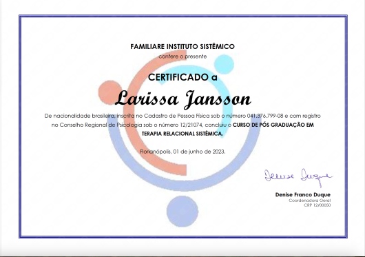Larissa sempre muito prestativa e com as melhores abordagens, em meus momentos mais críticos ela me ajudou a ver um outro sentido e levantar a cabeça! Sempre muito bom!