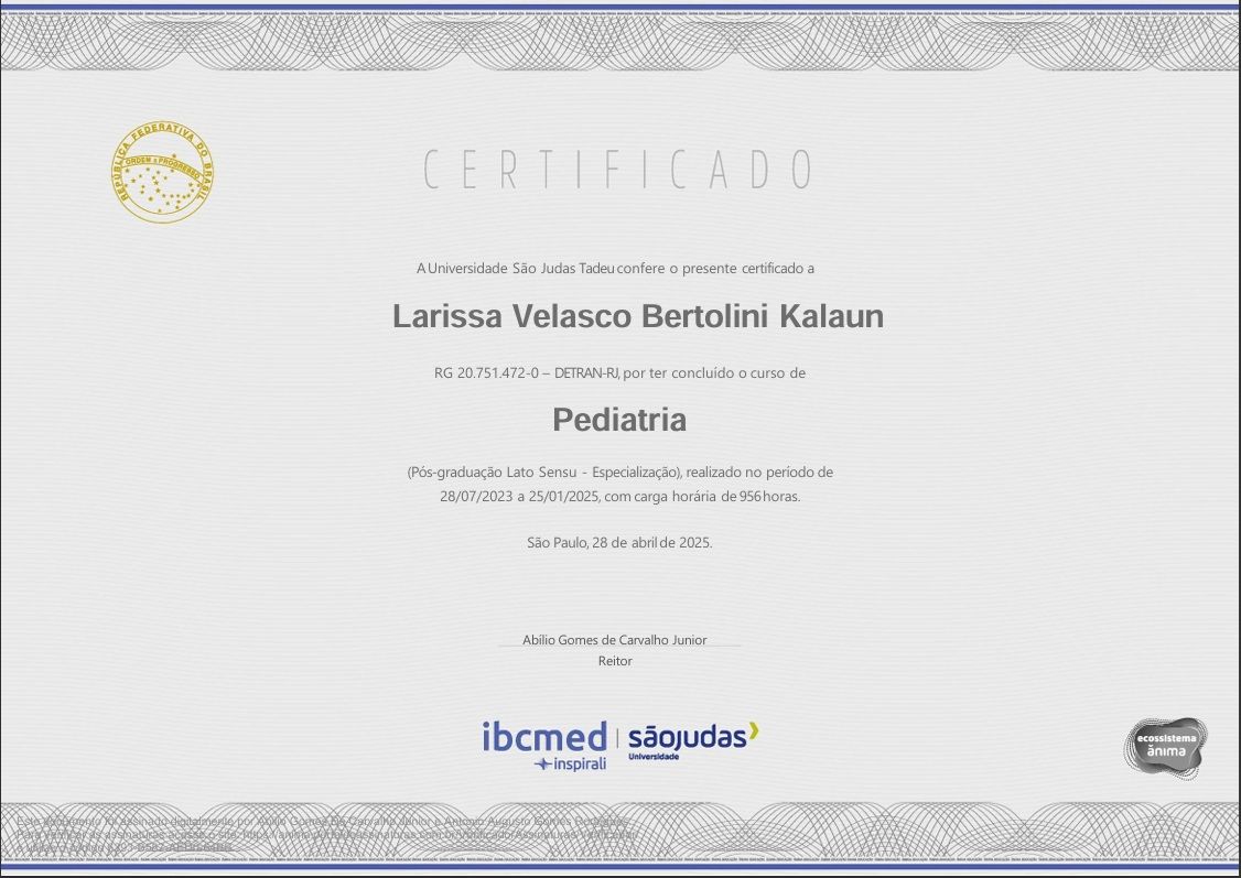 A Dra. Larissa é simplesmente maravilhosa! Cuida do meu filho com uma atenção e carinho que fazem toda a diferença. Sempre muito paciente, explica tudo com clareza e transmite uma calma que nos deixa super seguras como mães. Além de ser extremamente competente, demonstra um cuidado genuíno com o Pedrinho. Excelente profissional!