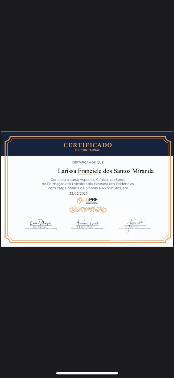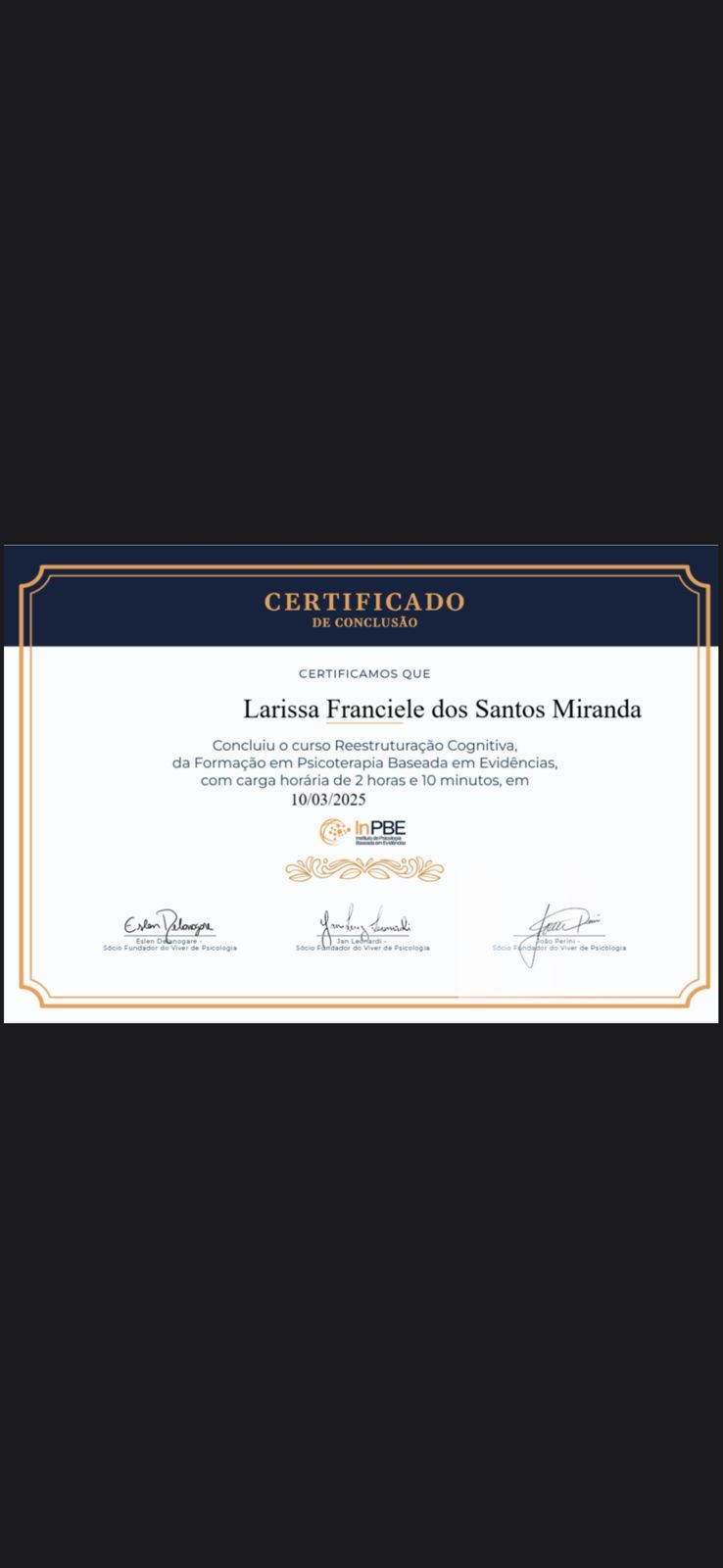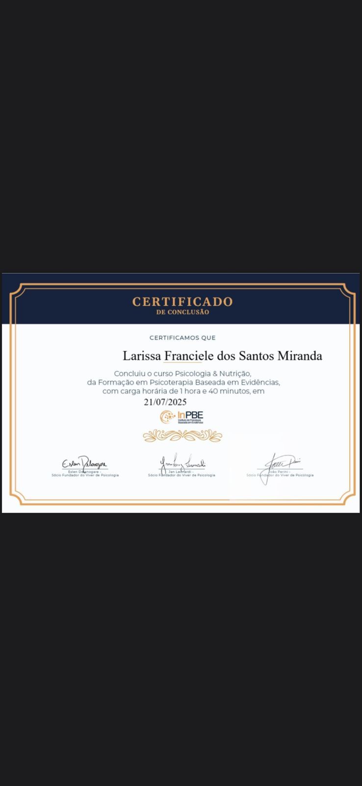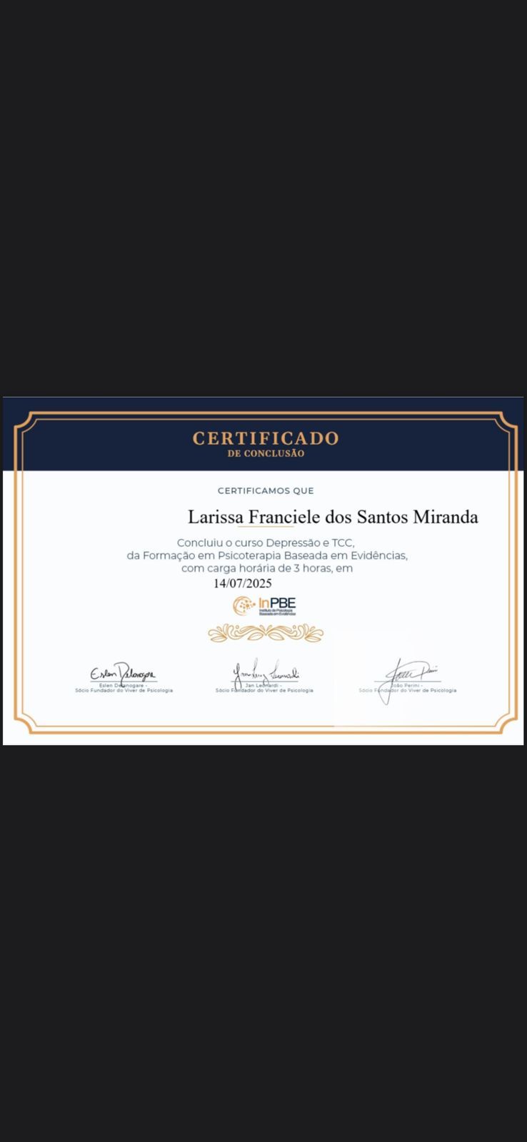 A Dra. Larissa é uma psicóloga ética, acolhedora e dedicada. Em seus atendimentos demonstra empatia e escuta ativa. Conduz o processo terapêutico com sensibilidade e segurança, buscando sempre a ampliação das perspectivas e possibilidades de seus pacientes. Com toda certeza, recomendo muita essa profissional!