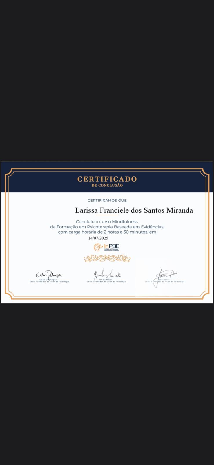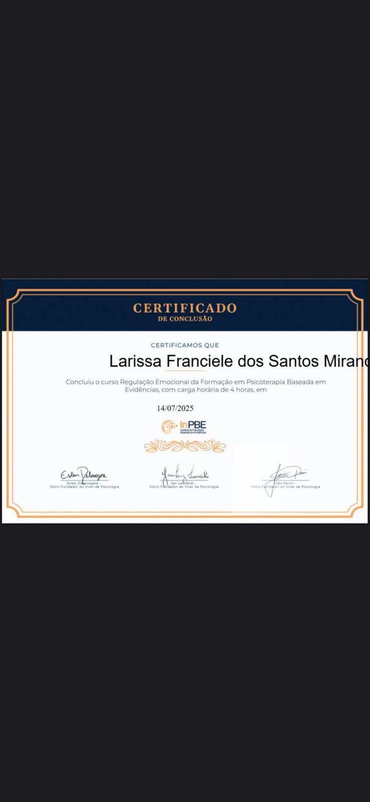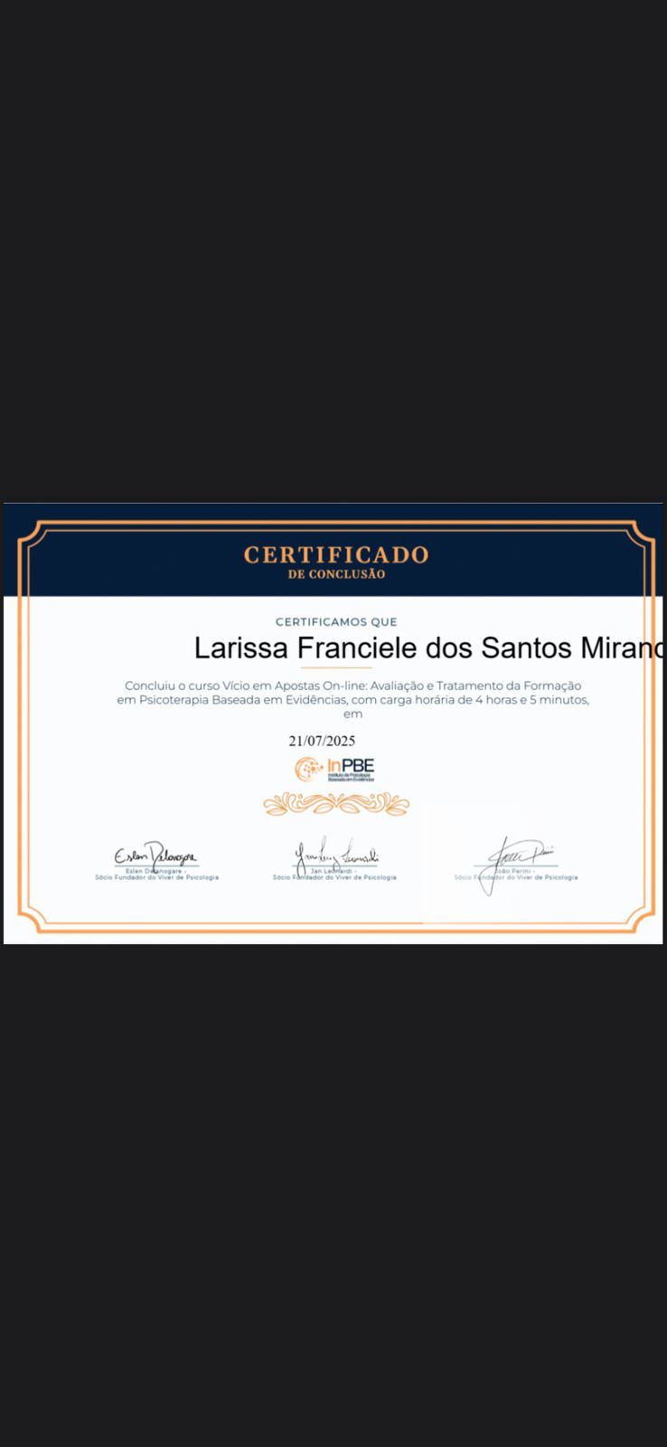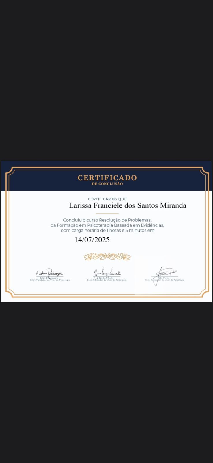A Dra. Larissa é uma psicóloga ética, acolhedora e dedicada. Em seus atendimentos demonstra empatia e escuta ativa. Conduz o processo terapêutico com sensibilidade e segurança, buscando sempre a ampliação das perspectivas e possibilidades de seus pacientes. Com toda certeza, recomendo muita essa profissional!