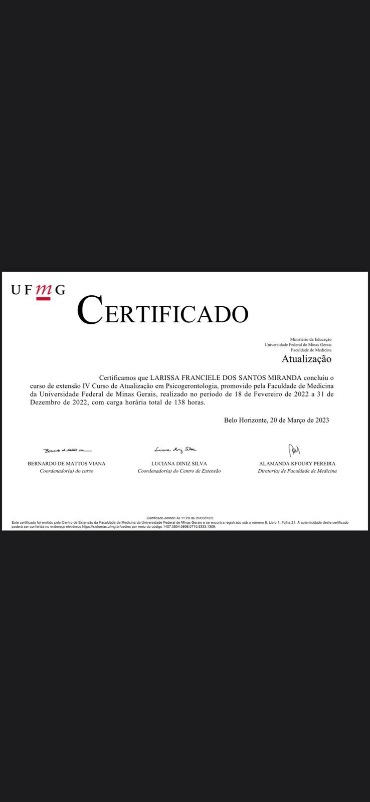 Sou Larissa Miranda, psicóloga clínica, pós-graduada em Terapia Cognitivo-comportamental. Formação em prática baseada em evidências pelo InPBE. Durante toda a minha formação, desenvolvi um grande interesse pelo atendimento clínico de adultos e idosos. Nesse sentido, realizei um estágio no ambulatório de psicoterapia do PROEPSI | UFMG, onde tive a oportunidade de desenvolver muitas habilidades psicoterapêuticas no acolhimento de idosos e cuidadores. Nesse mesmo período, conclui o Curso de Atualização em Psicogerontologia do PROEPSI. Atendo em consultório particular, tanto on-line quanto presencialmente, acolhendo jovens, adultos e idosos. Utilizo como abordagem psicoterapêutica a Terapia Cognitivo Comportamental e suas vertentes, com enfoque no tratamento de diversas demandas, como os transtornos de ansiedade, de humor, de personalidade, do sono, TDAH, TEA e TOC.