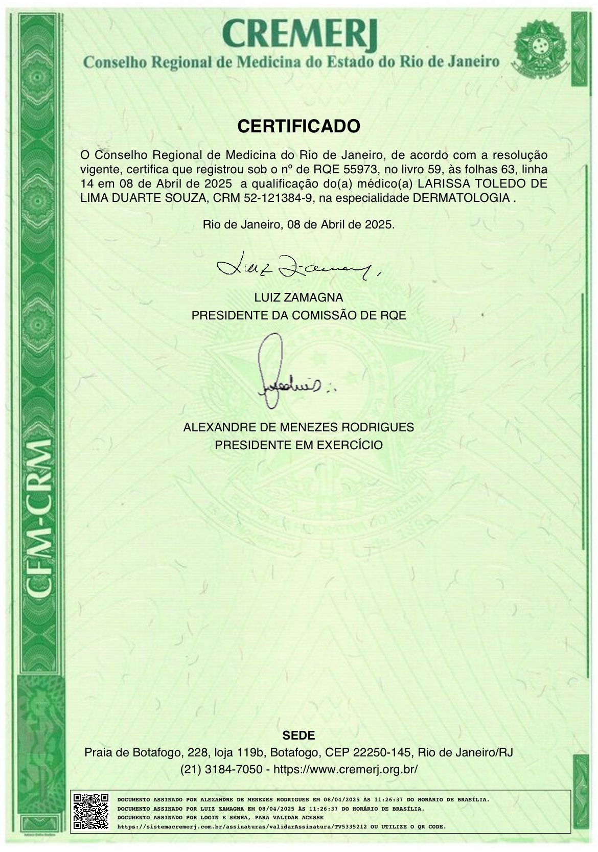 Quais são as principais especialidades de Larissa Toledo Souza?Larissa Toledo Souza é dermatologista. Te mostramos alguns dos serviços oferecidos pelo especialista graças à sua trajetória e vasta experiência: Primeira consulta Dermatologia, Consulta Dermatologia, Tratamento laser lavieen - cicatriz de acne, Aplicação da toxina botulínica, Aplicação de acido hialurônico, Ácido poliláctico - sculptra, Peeling químico, Dermatoscopia digital, Fototerapia, Laser facial.