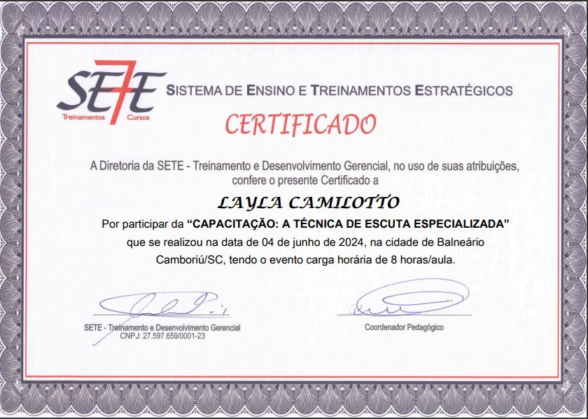 Minha participação constante em cursos de pequena duração me ampliam os caminhos para realizar uma terapia personalizada, adaptando cada tratamento às necessidades individuais.