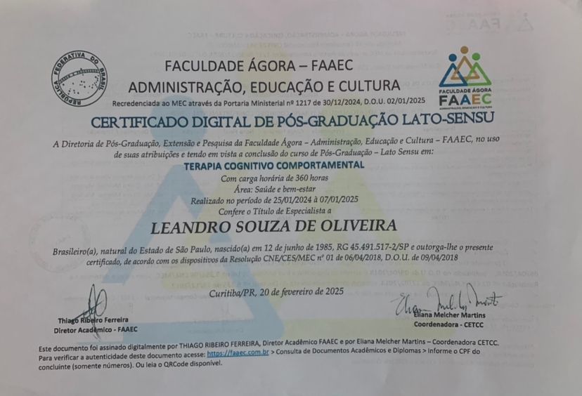 Sou paciente do Leandro desde 2017 e ele sempre me acolheu com muita empatia e profissionalismo. Ao longo desses anos, me ajudou a enfrentar e superar diversas dores emocionais, sempre com uma escuta atenta e sem julgamentos. As sessões com ele me proporcionam um espaço seguro para refletir, me conhecer melhor e evoluir como pessoa. Confio muito no seu trabalho e recomendo de coração.