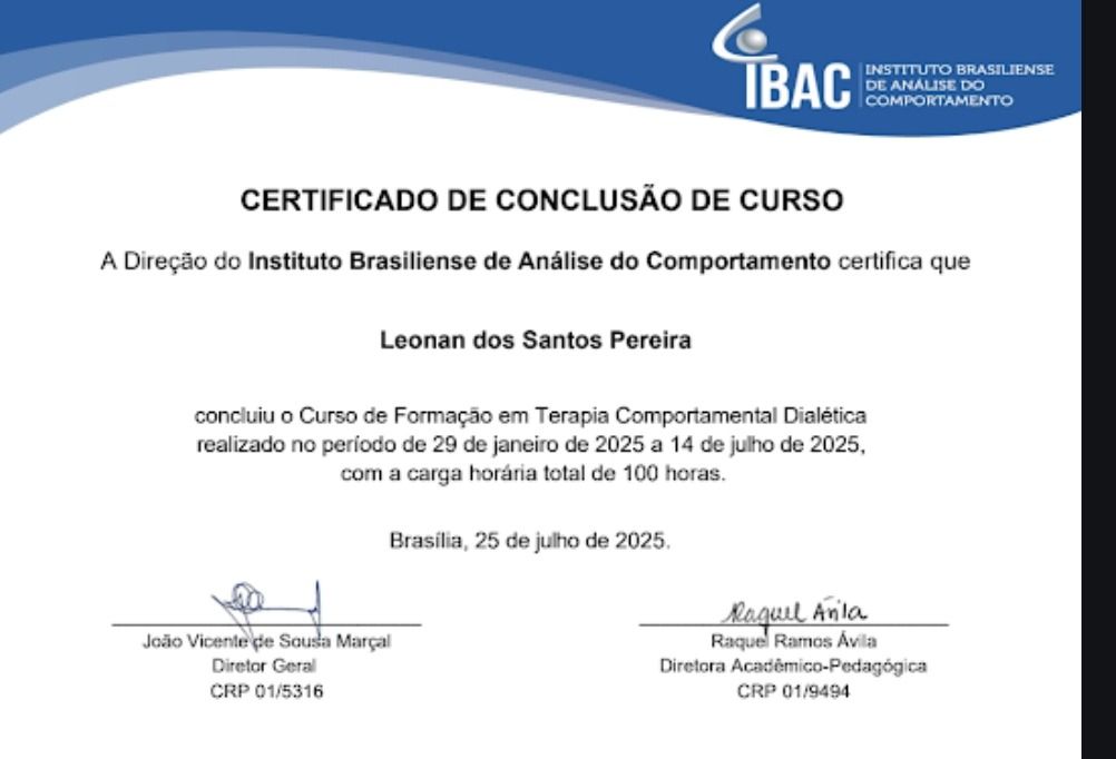 Olá, eu sou o Léo. Sou psicólogo pela PUC de Campinas e tenho atuado com a psicologia clínica com referência em práticas baseadas em evidências (PBE). Sou especialista em Análise Comportamental Clínica e trabalho com terapia individual para adolescentes, adultos e idosos e também com terapia de casal. Também sou palestrante e venho oferecido capacitações em manejo e cuidados em saúde mental em diferentes contextos. Minha abordagem de trabalho é a Análise do Comportamento e Terapias contextuais (Terapia de Aceitação e Compromisso, Terapia Comportamental Dialética, Terapia Analítico Funcional, Ativação Comportamental para Depressão) Te convido a conhecer o meu trabalho! “Não considere nenhuma prática como imutável. Mude e esteja pronto a mudar novamente.” B. F. Skinner