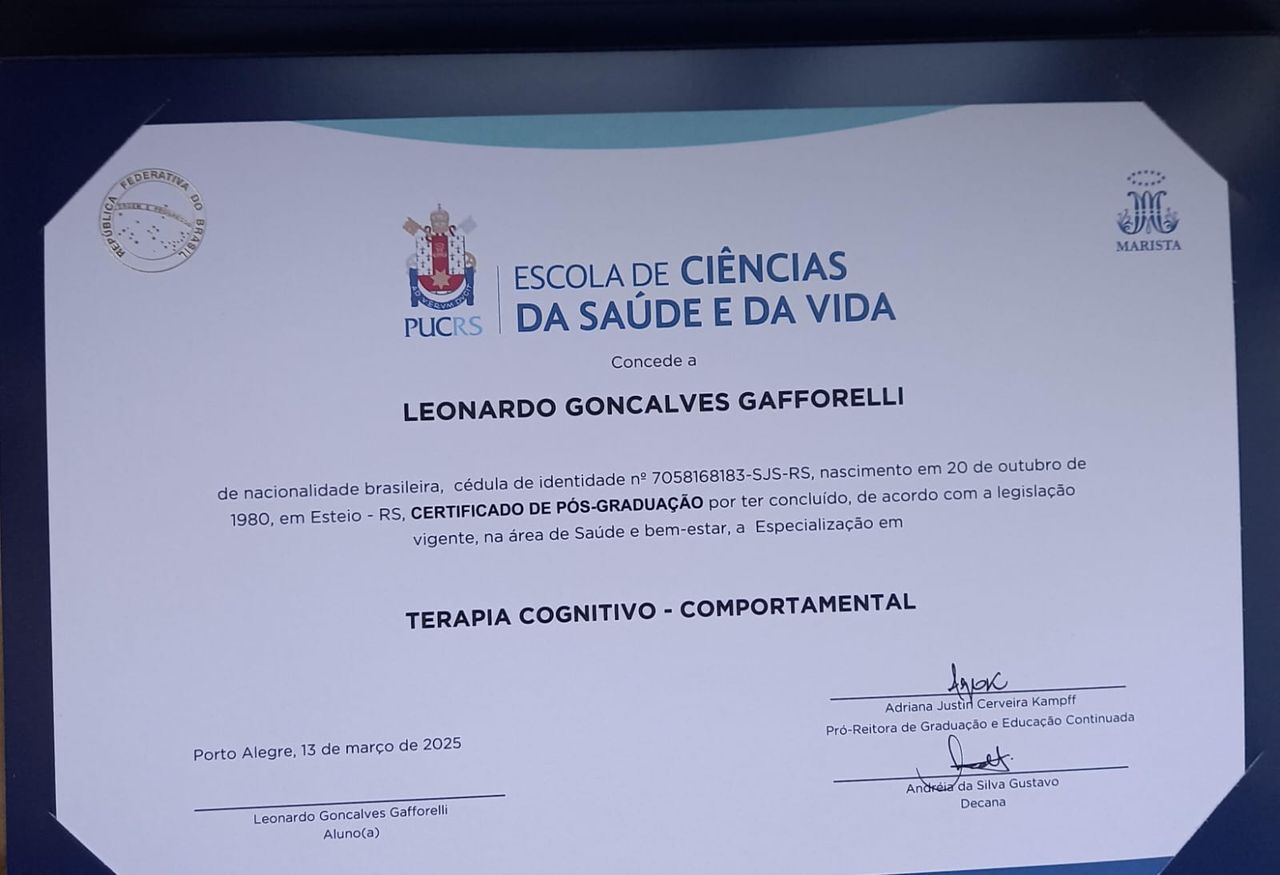 Quais são as principais especialidades de Leonardo Gonçalves Gafforelli?Leonardo Gonçalves Gafforelli é psicólogo. Te mostramos alguns dos serviços oferecidos pelo especialista graças à sua trajetória e vasta experiência: Psicoterapia, Consulta psicológica do adulto, Psicoterapia adulto, Tratamento de transtorno bipolar, Tratamento da depressão, Tratamento da ansiedade de separação, Terapia Cognitivo Comportamental, Transtorno de déficit de atenção e hiperatividade - TDAH, Tratamento da síndrome do pânico, Tratamento para transtorno da ansiedade generalizada (TAG).