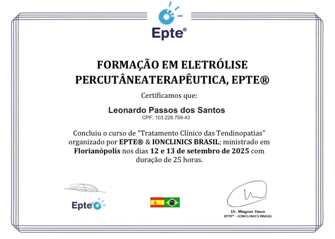 Além das técnicas tradicionais de reabilitação, sou formado em eletrólise percutânea terapêutica (EPI®), um método inovador e altamente eficaz no tratamento de tendinopatias e lesões crônicas. Essa abordagem, associada a recursos modernos e programas individualizados de fortalecimento e reequilíbrio muscular, potencializa os resultados e garante maior durabilidade nos ganhos.