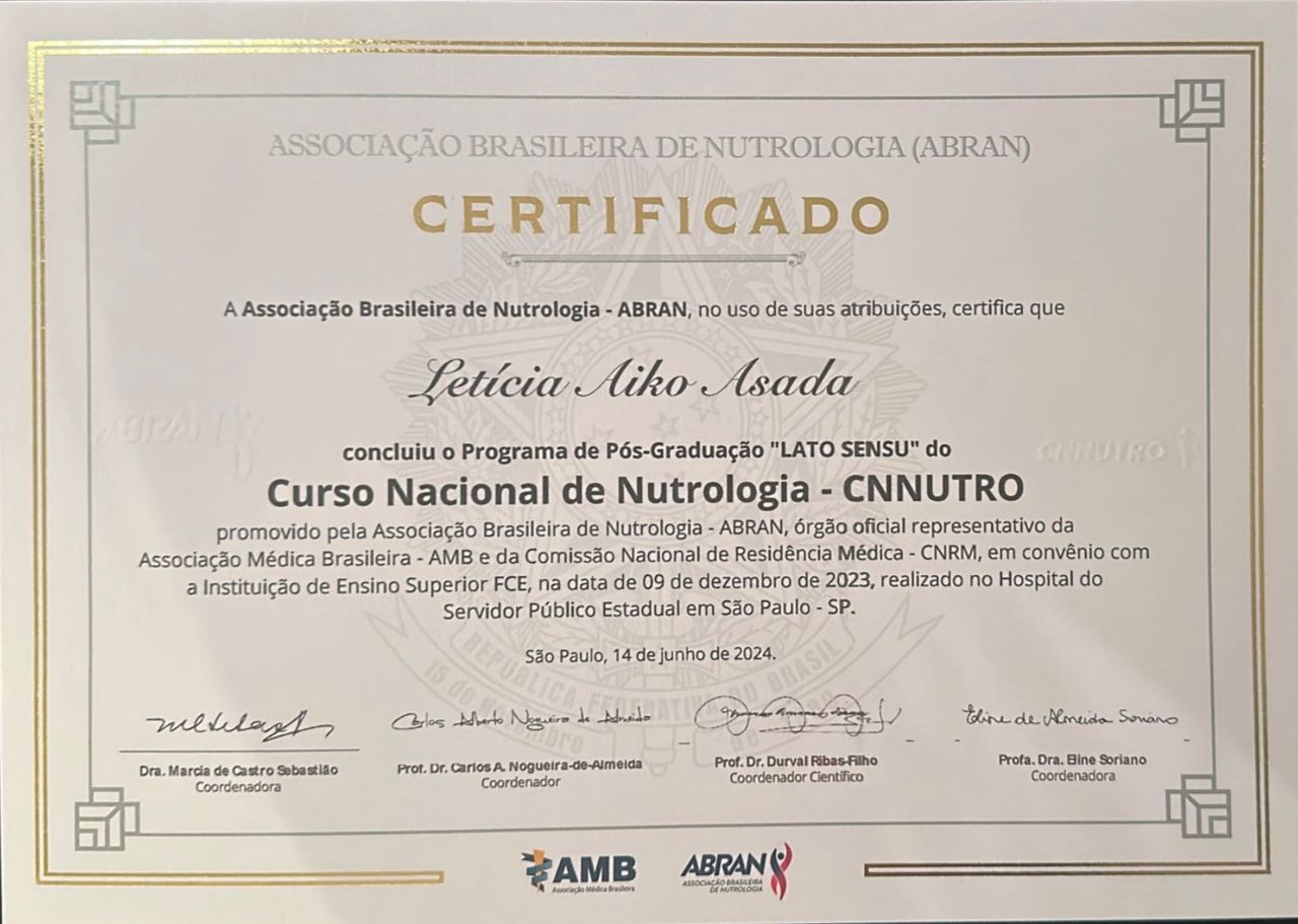 Durante minha formação no Instituto Israelita Albert Einstein, encontrei o universo da medicina funcional e descobri mais uma paixão: a Nutrologia. Como a prova de título é realizada pela ABRAN (Associação Brasileira de Nutrologia), foi por esse caminho que decidi trilhar minha pós-graduação.