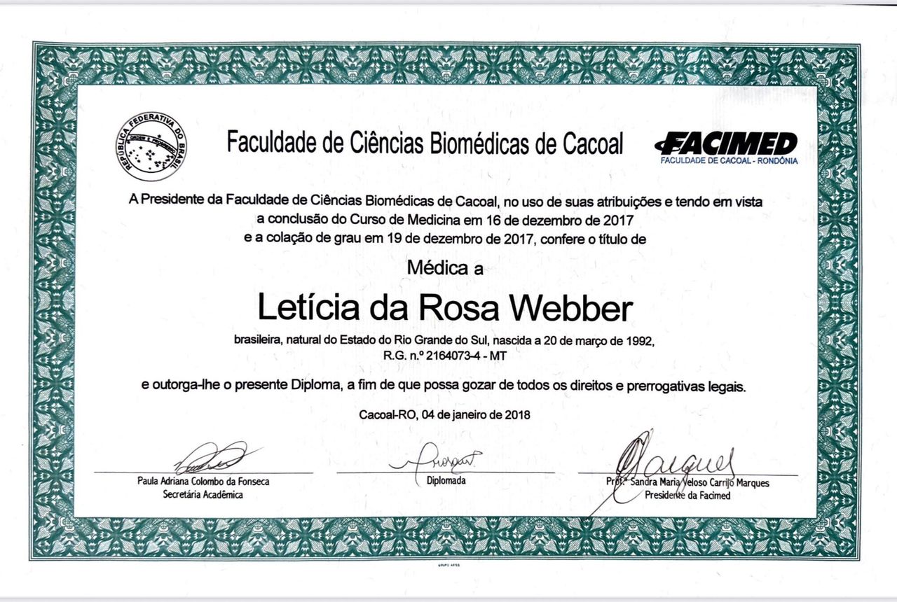 Você já passou por consulta com Dra. Leticia Da Rosa Webber De Oliveira? Conte aqui como foi. Outros pacientes vão te agradecer por ajudá-los a escolher o melhor especialista.