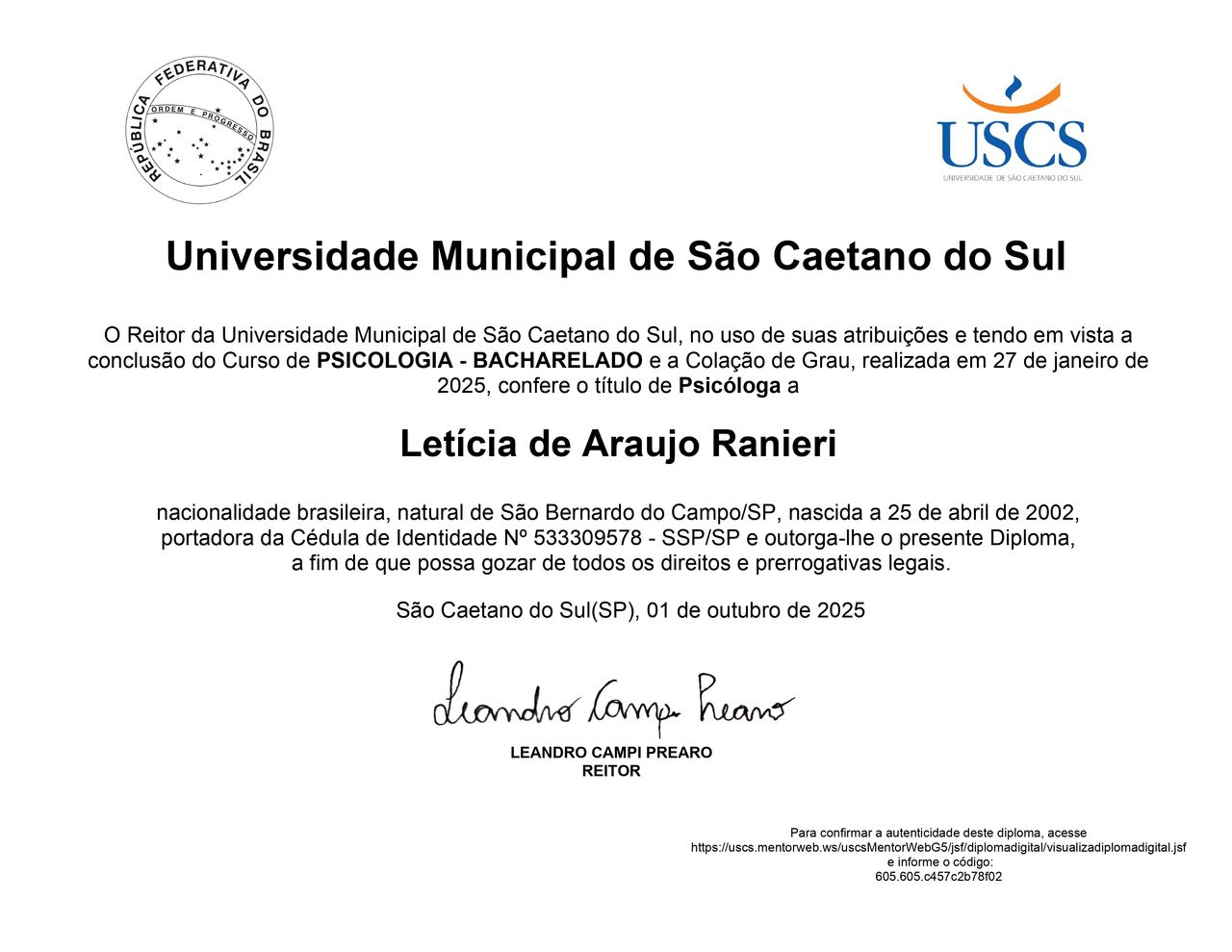 Sou formada pela Universidade Municipal de São Caetano do Sul (2024), atuo como psicóloga clínica atendendo adolescentes e adultos.