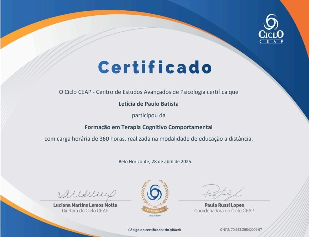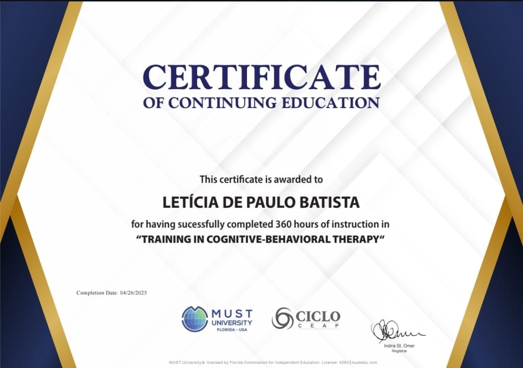 Formação em Terapia Cognitivo Comportamental - Must Univercity e Ciclo Ceap.