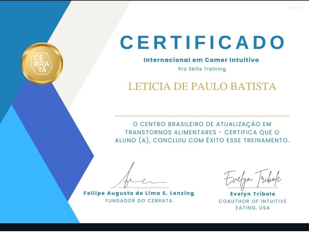 Aprimorada em Transtornos Alimentares pelo Hospital das Clínicas - Instituto de Psiquiatria do Hospital das Clínicas da Faculdade de Medicina da Universidade de São Paulo.