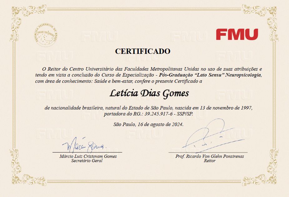 Quais são as principais especialidades de Leticia Dias Gomes?Leticia Dias Gomes é psicóloga. Te mostramos alguns dos serviços oferecidos pelo especialista graças à sua trajetória e vasta experiência: Primeira consulta psicologia, Avaliação Neuropsicológica c/ laudo, Atendimento Psicológico online para adulto, Atendimento Online em Psicoterapia.