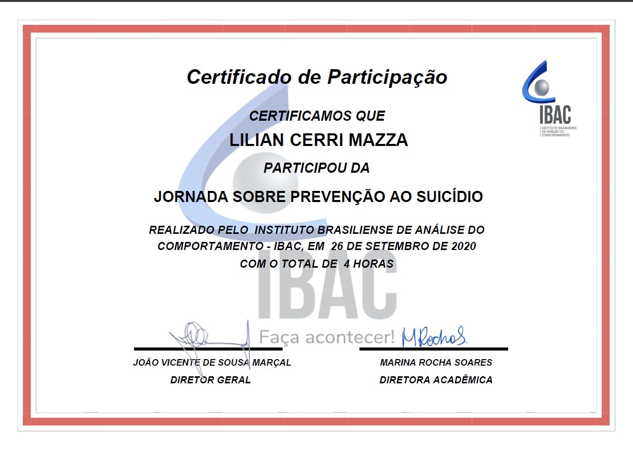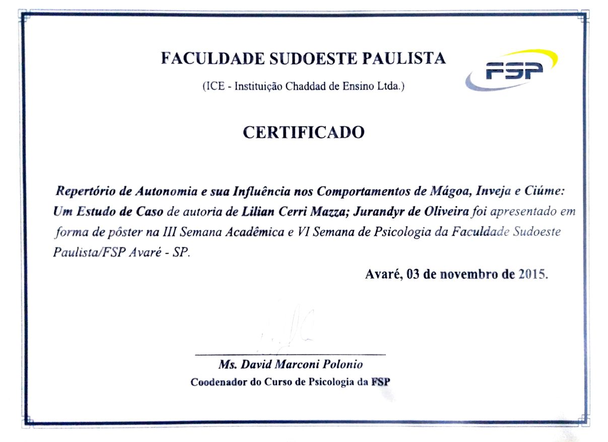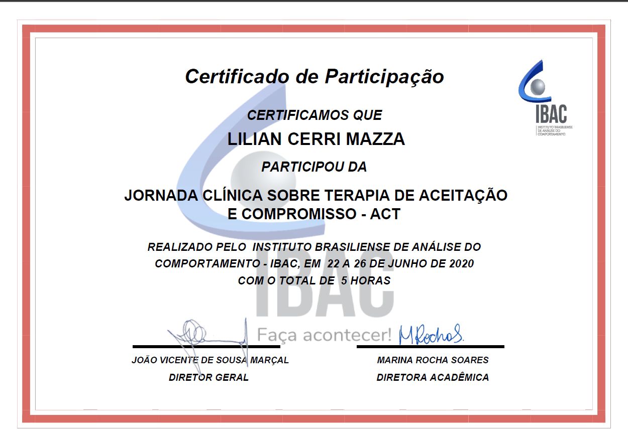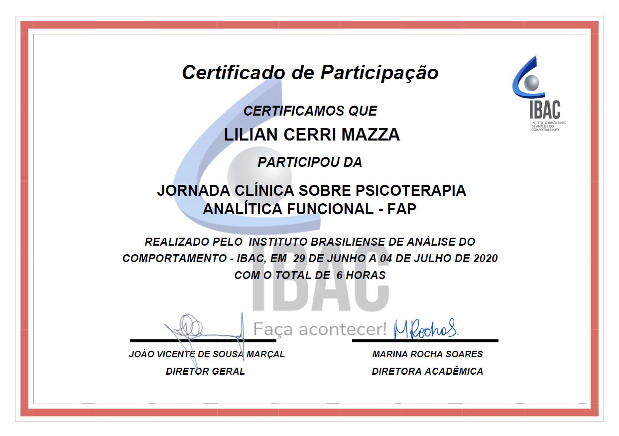Acredito que empatia é a qualidade mais essencial de uma terapeuta e o melhoramento profissional deveria ser realizado por todo psicólogo como forma de cuidado com o próximo. Procuro sempre me atualizar dos melhores procedimentos dentro da Psicologia e da Análise do Comportamento.