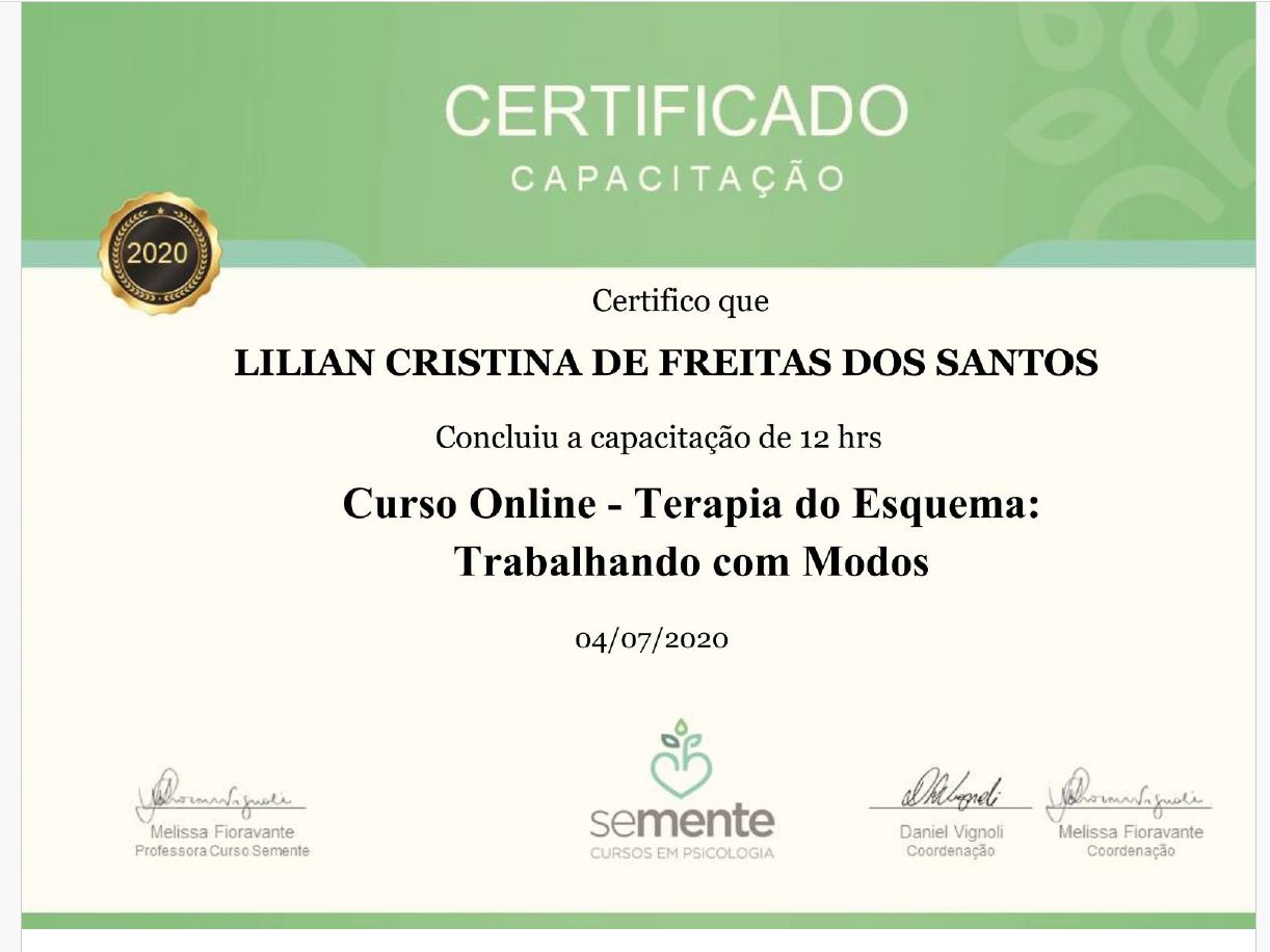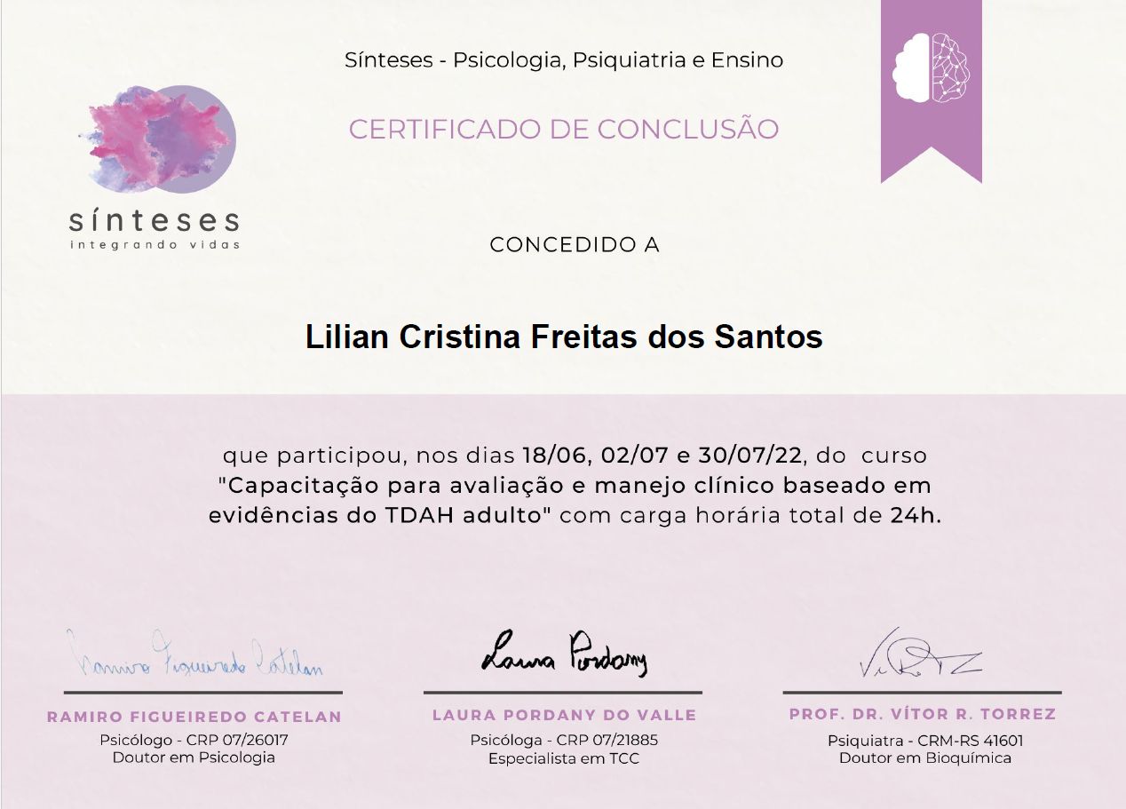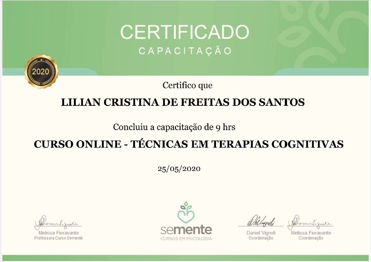 Posso passar por atendimento online com Lilian Cristina de Freitas dos Santos, sem ter que ir até o consultório?Sim, Lilian Cristina de Freitas dos Santos oferece atendimento online. Basta selecionar "Teleconsulta" ao agendar sua consulta e você poderá ver as datas e horários disponíveis.