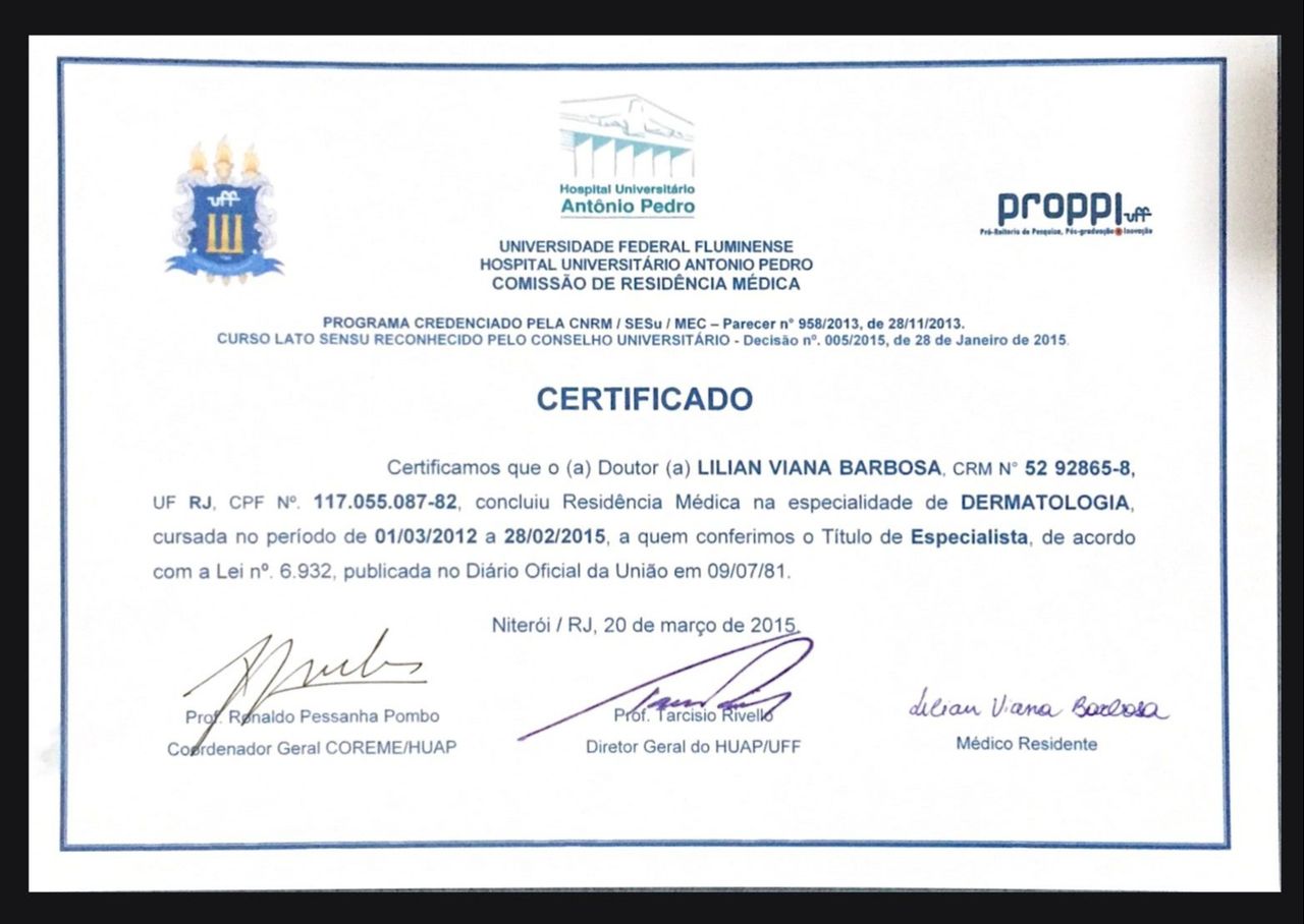Sou médica formada pela Universidade Federal Fluminense (UFF) há 15 anos. Realizei minha residência médica em Dermatologia na mesma instituição, onde adquiri sólida formação na prevenção, diagnóstico e tratamento das doenças da pele. Recebi o título de especialista em dermatologia pela AMB e sou membro da Sociedade Brasileira de Dermatologia (SBD). Possuo especialização em Saúde Integrativa, Fitoterapia e Naturopatia pela USI.
