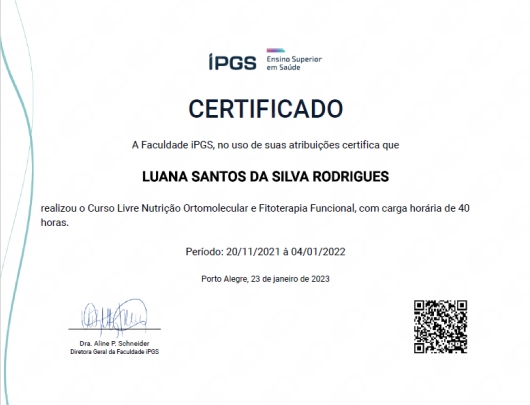 Me chamo Luana Rodrigues, em meu currículo consta vários cursos e especializações entre eles: Suplementação e Fitoterapia Esportiva, Nutrição Ortomolecular, Fitoterapia Funcional e Nutrição Comportamental.