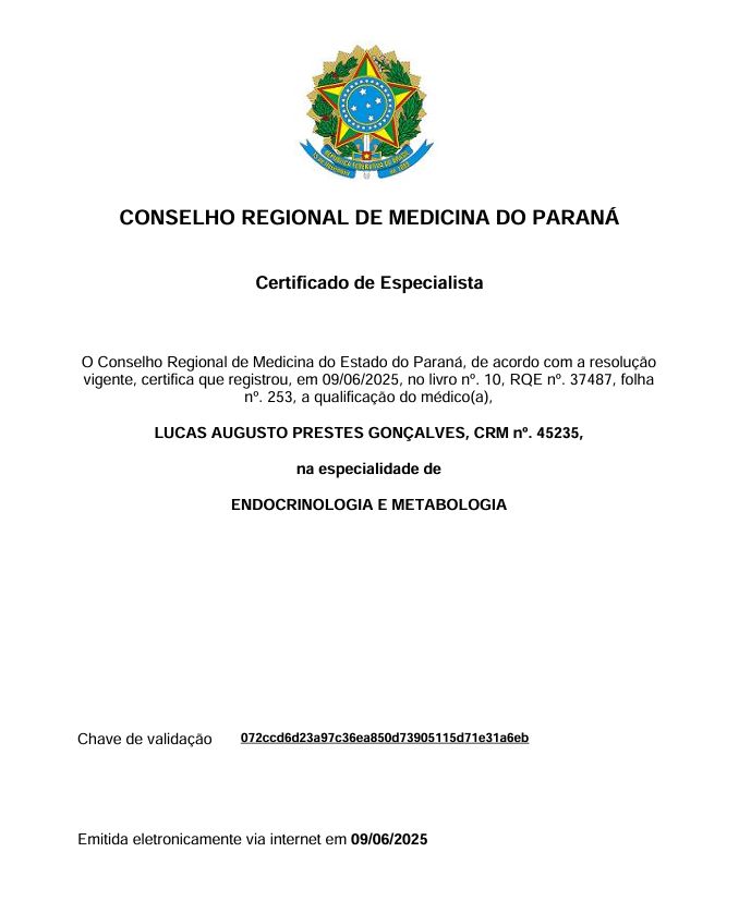 Sou endocrinologista com formação pelo Centro de Diabetes Curitiba, com atuação dedicada, acolhedora e atualizada. Tenho experiência no cuidado integral com foco em distúrbios hormonais, metabólicos e no manejo do sobrepeso e obesidade. Acredito em um atendimento humano e individualizado, respeitando as particularidades de cada paciente.