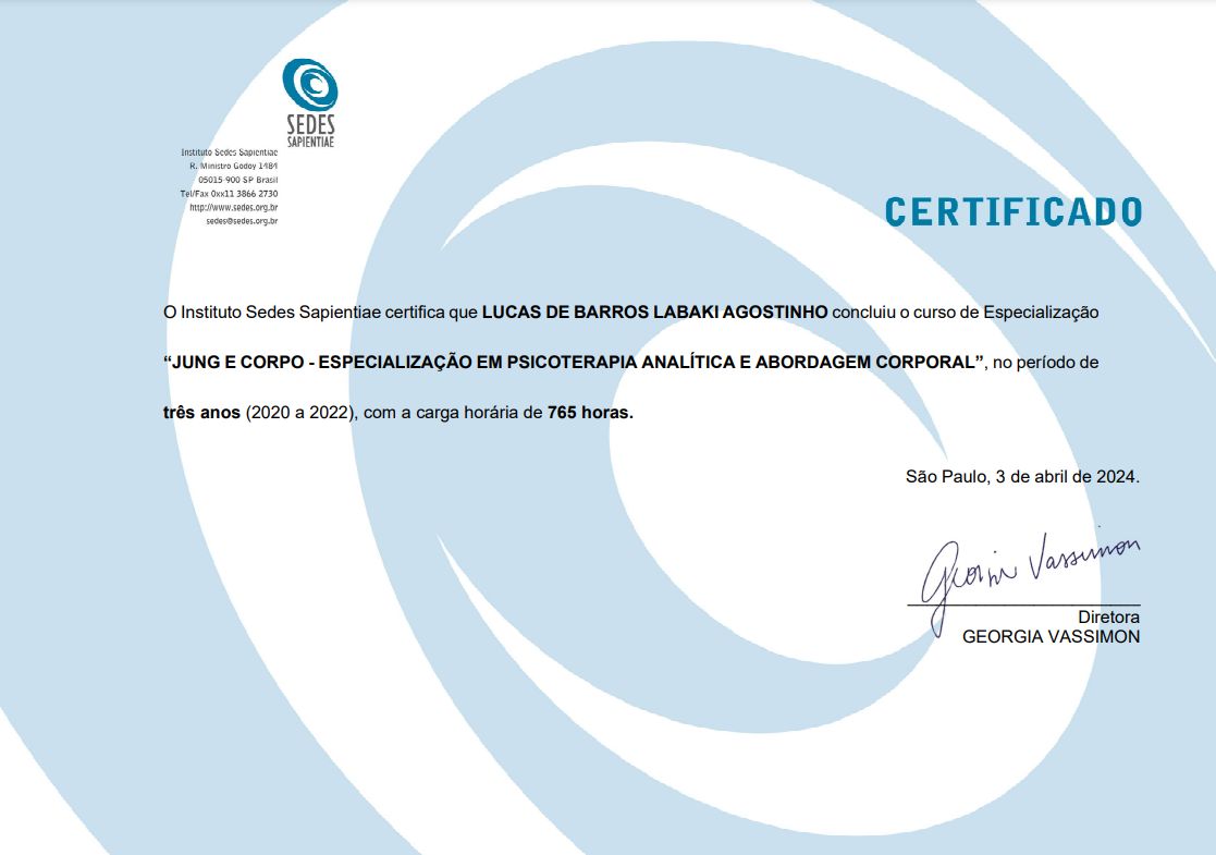 Como destaque, cursei a especialização Jung e Corpo, no Instituto Sedes Sapientiae. Assim, na minha prática, busco sempre olhar mente e corpo como um todo, trabalhando os sintomas de ambos como complementares. Caso seja do interesse do paciente, também é possível realizar trabalhos corporais, como exercício de respiração e relaxamentos, que colaboram para alcançar um maior equilíbrio emocional e ajudar no alívio de sintomas.