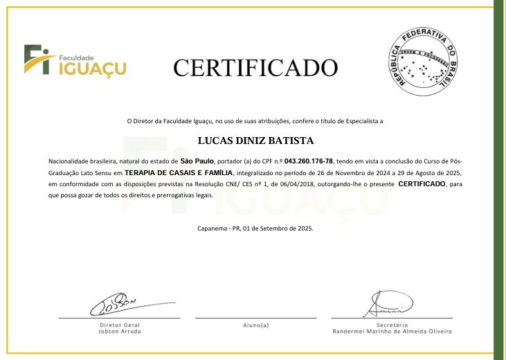 Sou psicólogo, formado pela Universidade Federal de Uberlândia (UFU) em 2004, com especialização em Psicologia Clínica e atuação principalmente pela abordagem cognitivo-comportamental.