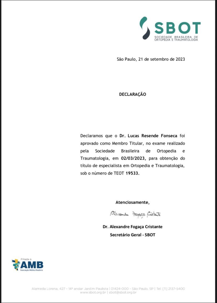 Quais são as principais especialidades de Lucas Resende Fonseca?Lucas Resende Fonseca é ortopedista - traumatologista. Te mostramos alguns dos serviços oferecidos pelo especialista graças à sua trajetória e vasta experiência: Primeira consulta ortopedia e traumatologia, Artroplastia De Revisão Do Quadril, Ortopedia geral, Tratamento para dor no quadril, Cirurgia do quadril, Viscossuplementação, Infiltração de substâncias em cavidade sinovial (articulação), Bloqueio de nervo periférico, Tratamento da dor no ombro, Tratamento de dor lombar.