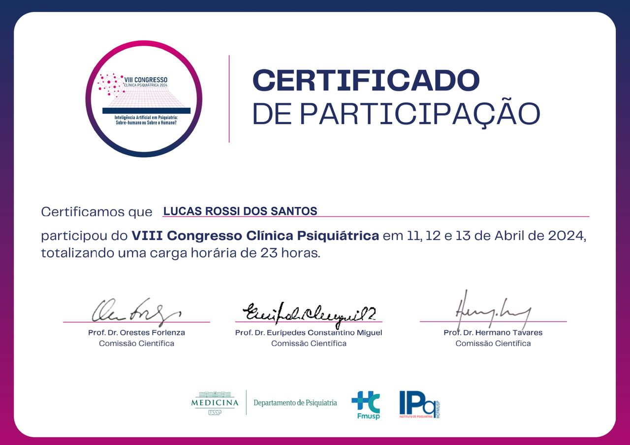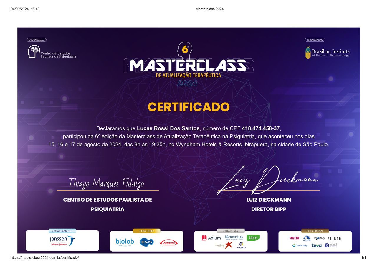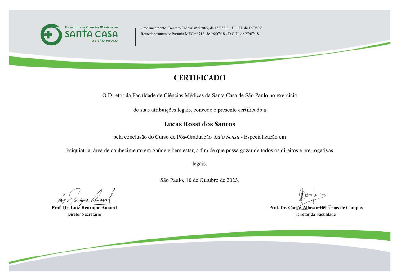 Olá! Sou o Dr. Lucas, muito prazer! Sou formado em medicina pela Pontifícia Universidade Católica - PUC, com especialização em Psiquiatria pela Faculdade de Ciências Médicas da Santa Casa de São Paulo por meio de pós-graduação latu-sensu. Possuo experiência em clínicas especializadas e hospitais psiquiátricos. Busco atender a todos visando preço acessível. Trabalho com reembolso de convênio através de recibo. No momento, apenas a modalidade de teleconsulta está disponível.
