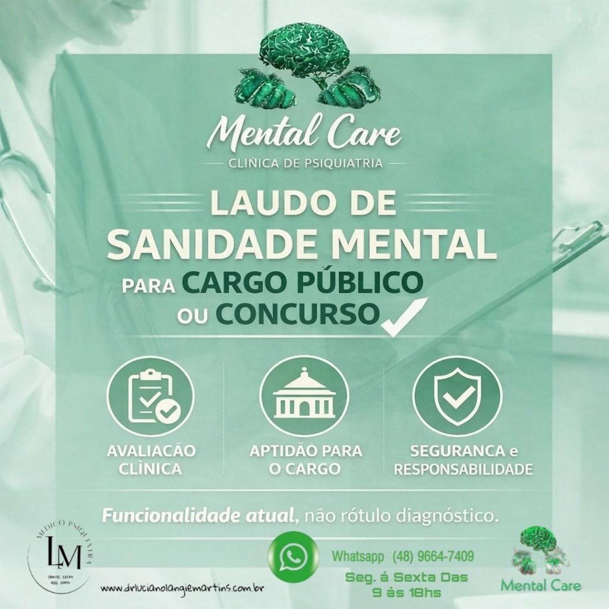 Atendimento psiquiátrico especializado voltado à emissão de laudo de sanidade mental, conforme exigências formais de editais de concursos públicos, cargos civis ou militares, academias de formação e processos de nomeação que demandem avaliação psiquiátrica oficial.