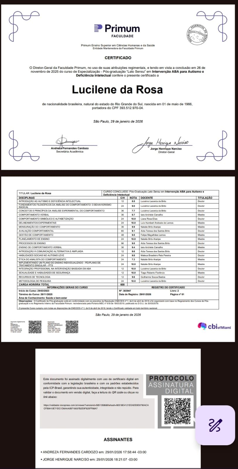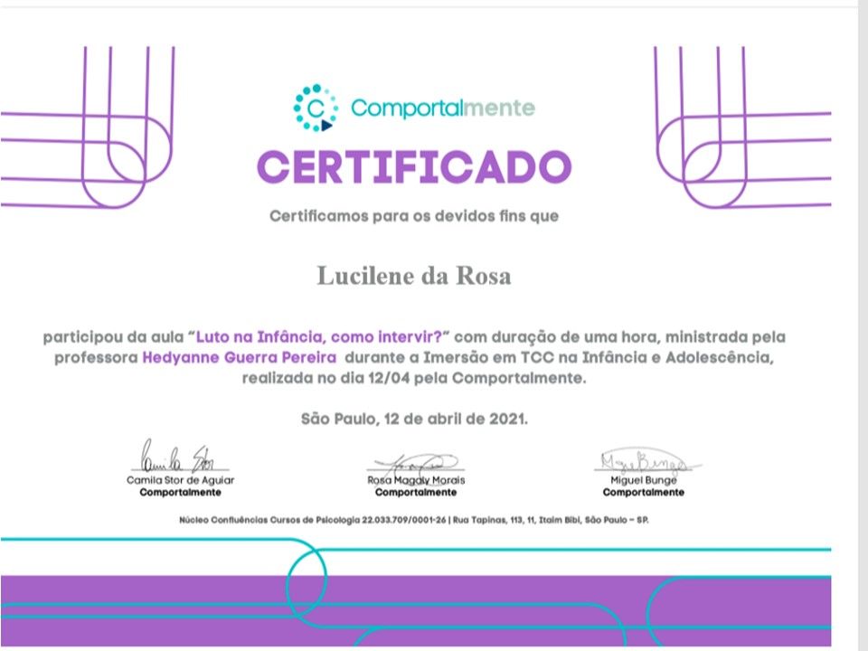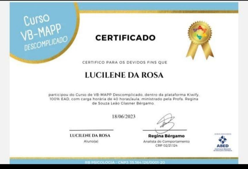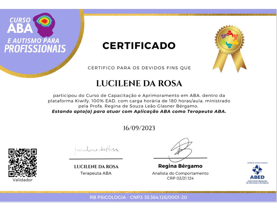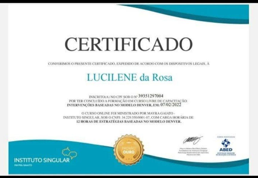 Quais são as principais especialidades de Lucilene da Rosa?Lucilene da Rosa é psicóloga. Te mostramos alguns dos serviços oferecidos pelo especialista graças à sua trajetória e vasta experiência: Primeira consulta psicologia, Consulta Psicologia, Psicoterapia, Tratamento da ansiedade, Acompanhamento de transtorno de TDAH, Acompanhamento a pacientes com: ansiedade,depressão, fobias e traumas psicológicos, Diagnóstico e tratamento de autismo/transtorno do espectro autista, Avaliação neuropsicológica, Análise do Comportamento Aplicada (ABA), Terapia ABA.