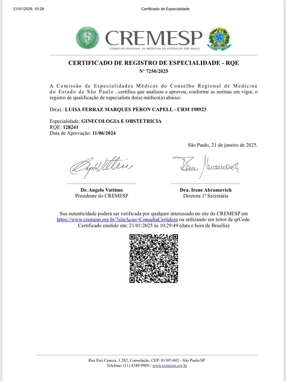 Gostaria de deixar um agradecimento especial à Dra. Luisa pelo atendimento de ontem. Fui muito bem acolhida — ela foi extremamente atenciosa, explicou cada detalhe com clareza e demonstrou uma verdadeira preocupação em acompanhar meu caso de perto. Saí da consulta me sentindo tranquila, bem informada e confiante. Recomendo de coração o trabalho da Dra. Luisa Capell pela dedicação e cuidado com que exerce a profissão.